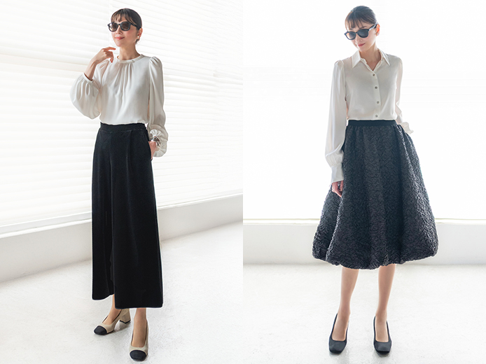 エレガントな丈感とボリュームのあるシルエットが、脚をすらりと美しく見せてくれます。