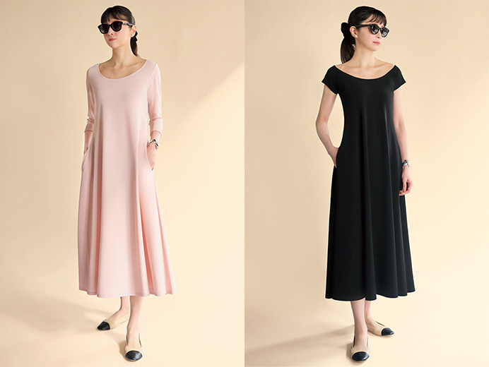 どちらもストレッチ性に優れ、適度な厚みがあり、体やインナーのラインを拾いにくいダブルジャージー素材を使用しました。