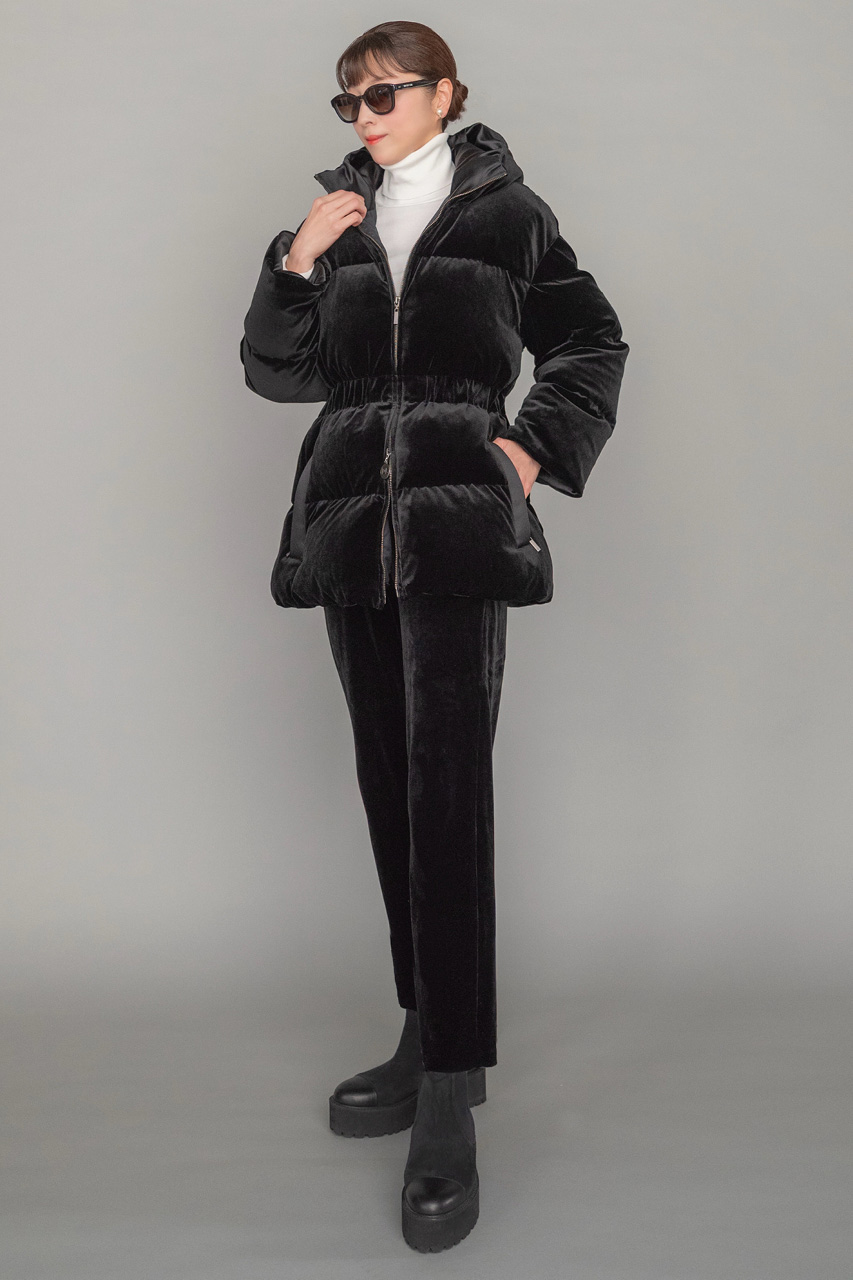 真冬の装いを格上げする、ベロアとサテンが上品なニュアンスを添える、ラグジュアリーなダウンコート。