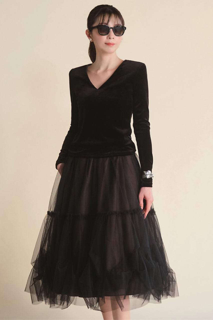 ネックラインに施された繊細なチュールフリンジが、顔まわりを春らしく華やかに彩る洗練のベロアトップ。