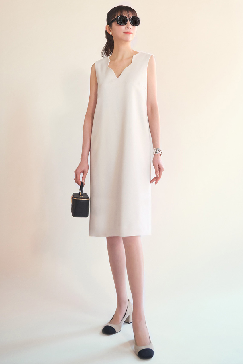 波打つようなスカラップのネックラインが、顔まわりを華やかに彩るタンクドレス。視線を上へと導くデザインが首元をすっきりと見せ、ネックレスなどのアクセサリーも美しく映えます。