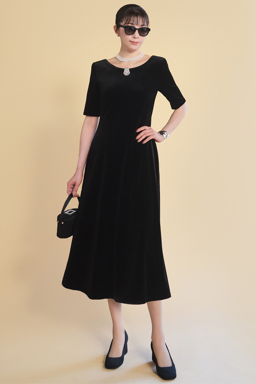 “デイジーベロア”を使用した、前後2WAYで楽しめる新作ワンピース。艶やかな光沢が肌を美しく見せるブラックは、アクセサリー次第で日常のリラックスシーンから華やかな場面まで対応します。