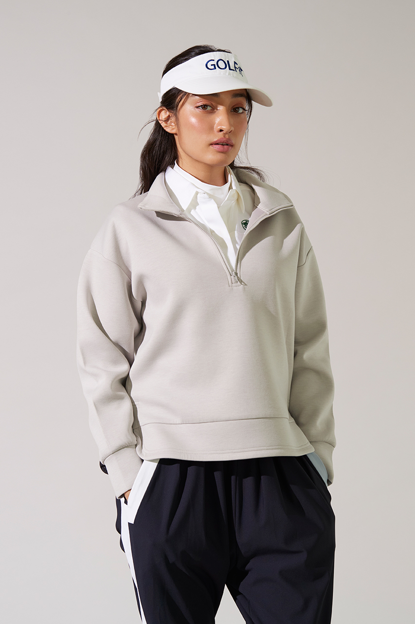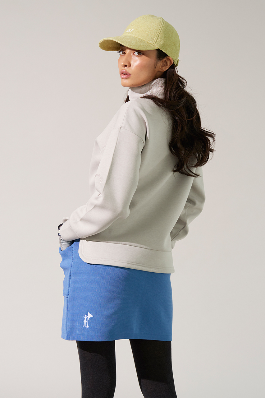 ジップアッププルオーバーは、洗練された印象でラウンドをスタイリッシュに演出。セットアップでコーディネートできるトラペーズスカートは、ヒップラインを拾わない絶妙な台形シルエットで、両サイドのスリットと裾のステッチがアクセントに。