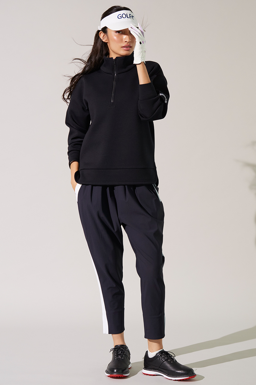 生地はキックバック(弾性回復力)が高く、適度なハリと滑らかな肌触りでシワになりにくく快適。春秋冬の3シーズンで着用できる実用性も魅力です。シンプルながら、シルエットの美しさで差がつく、秋冬のゴルフスタイルを楽しんで。