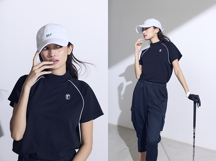 モード感漂うモックネックがスタイリング全体を引き締め、ラグランラインにあしらったコードデザインがさりげなくトレンドをプラス。左胸に配したゴルフウーマンの刺繍が、控えめながらも印象的なアクセントに。しなやかなハリと上質な表面感を備えた素材は、真夏でも涼やかで快適な着心地をキープ。着こなしを選ばず、プレーシーンはもちろん、デイリーにも自然に溶け込みます。