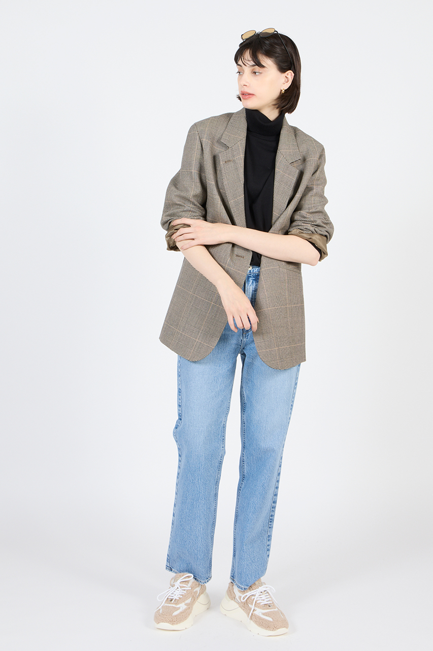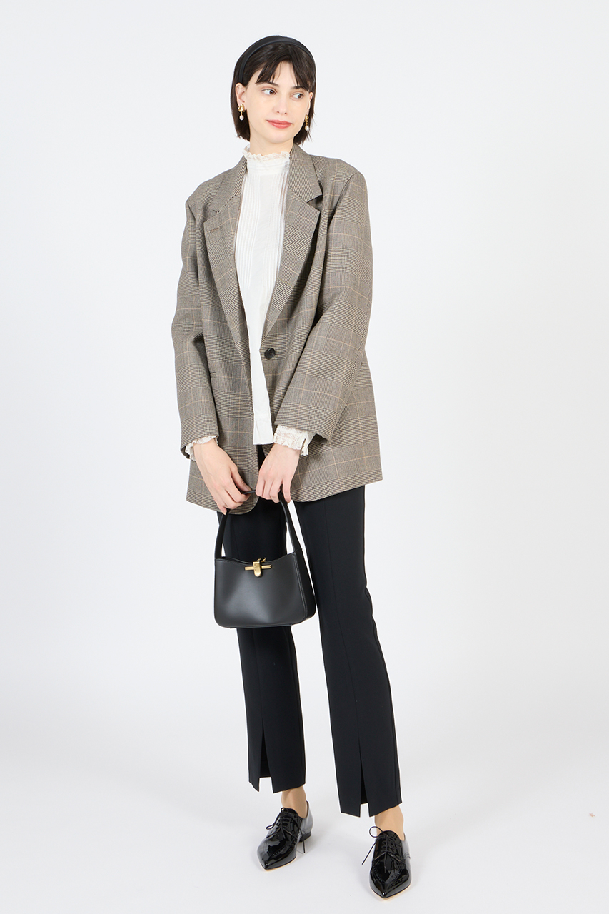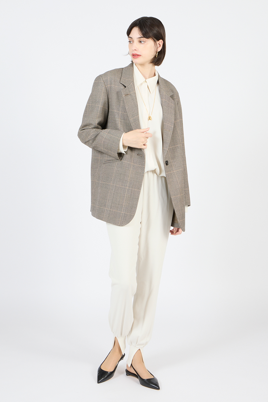 表はグレンチェック柄、裏はベージュの二重織の生地を使用した別注ジャケット。肉厚でありながら軽量なのが特徴で、シーズン長く重宝します。コートのようなオーバーサイズで、ゆったりとしたシルエットに淡く暖かな色味がスタイリッシュでどんなコーディネートにも合わせやすい!