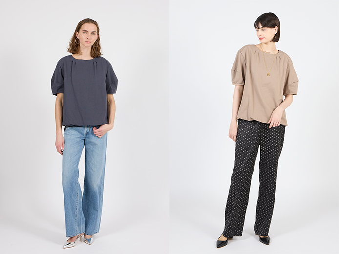ハリ感・シャリ感のある薄手の綿裏毛で、毛羽立ちにくくツルッとした独特な表面感とドライタッチな素材感が特徴的な夏でも着用いただけるプルオーバー。こだわりのパターンと生地選びで、袖と裾がバルーンのような立体的なシルエットに仕上がっています。