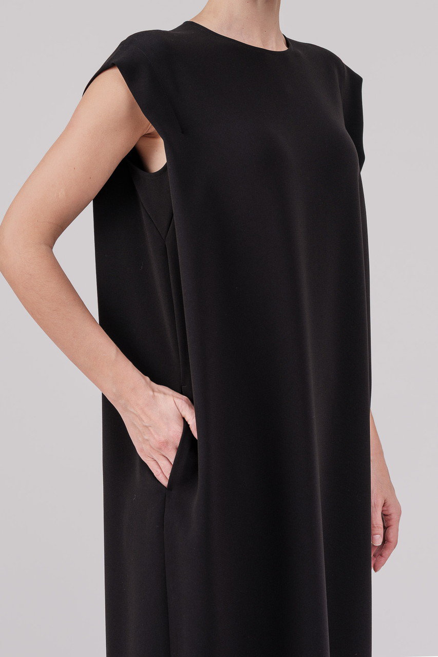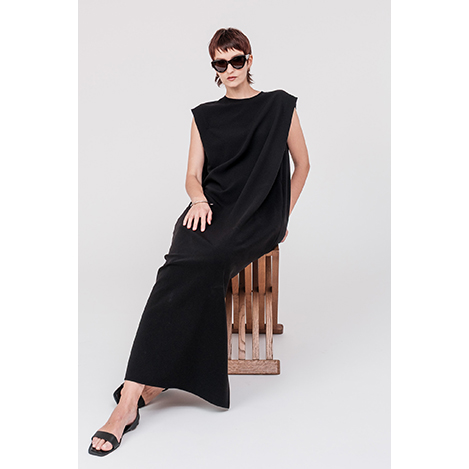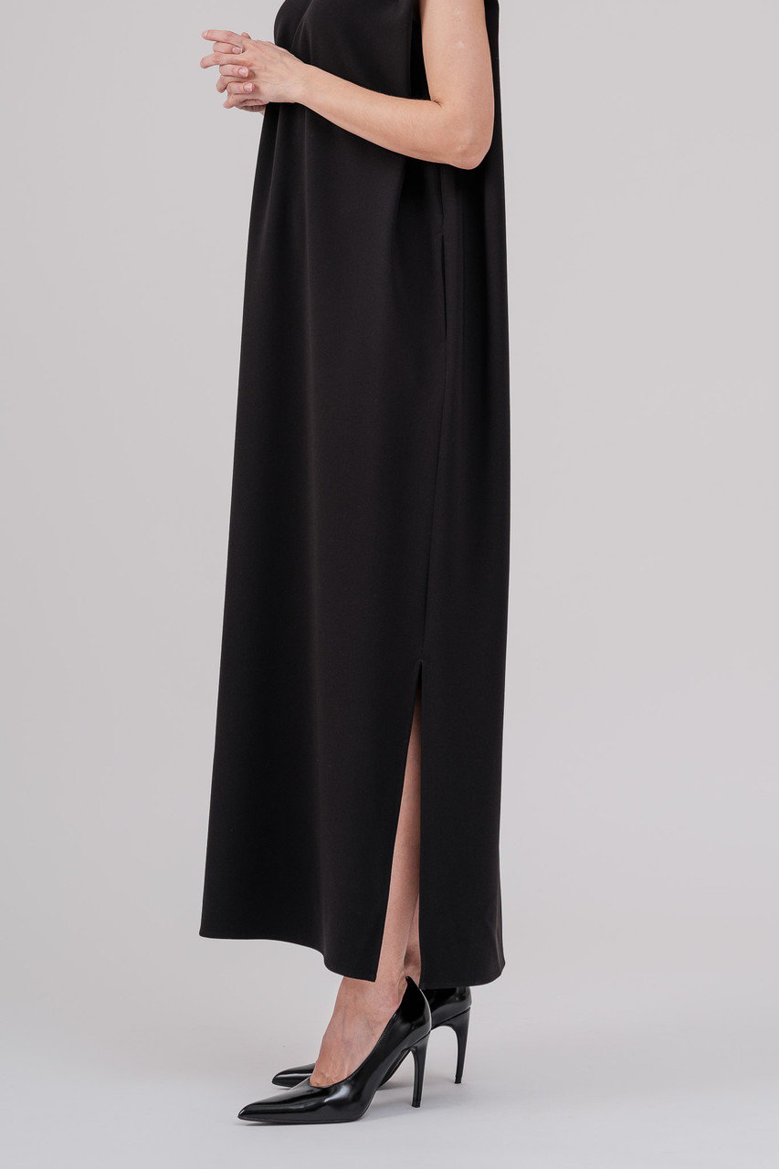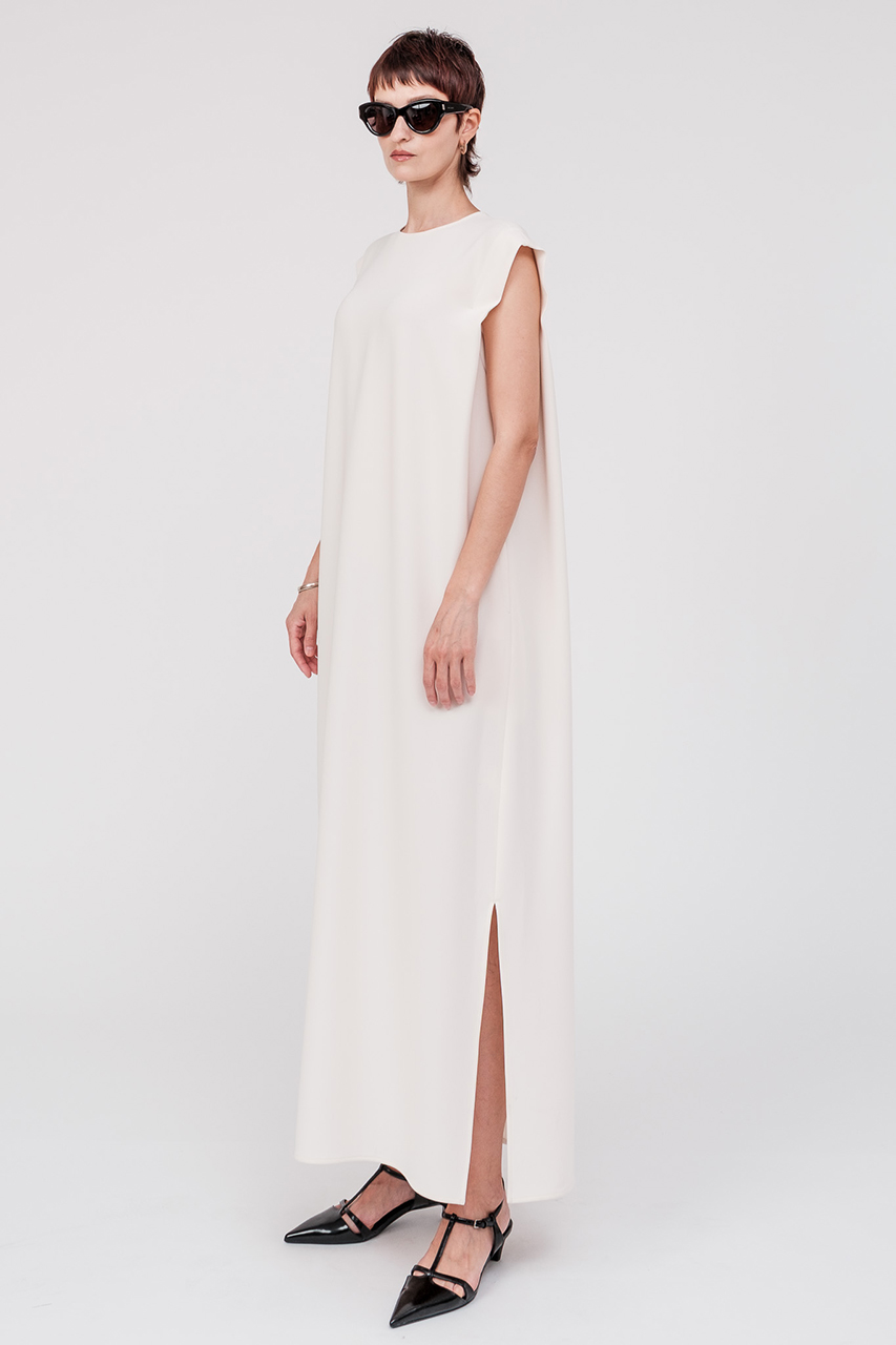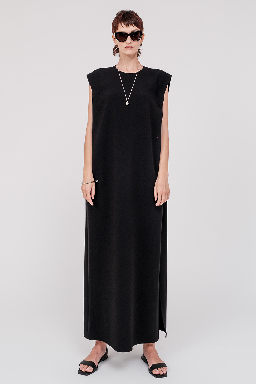 1着で洗練された印象を与えるミニマルなロングドレス。直線的なラインと肩の構築的なフォルムが差を付けるデザイン。自然なドレープが優雅さを演出し、さらにスリットが入ることで女性らしい印象を与えつつ、足さばきも◎。ドライなタッチのトリアセテートポリエステル生地は、軽い着心地はそのままにしっかりとした肉厚な生地感なので、夏1枚でも安心感を与えます。