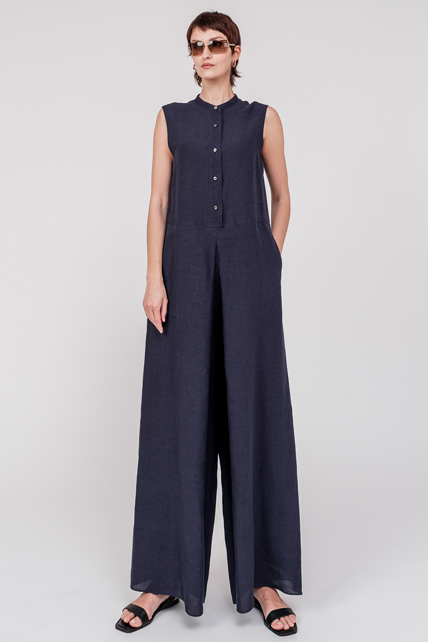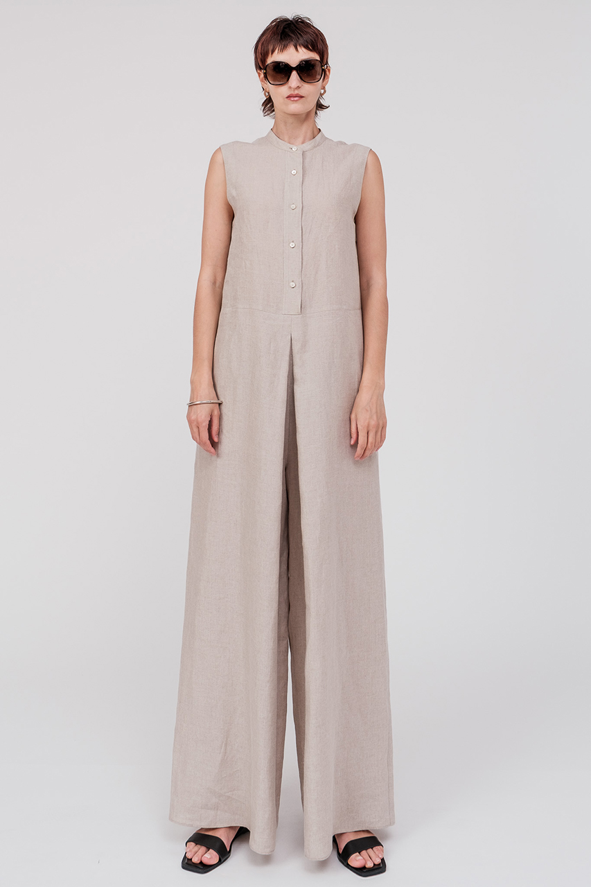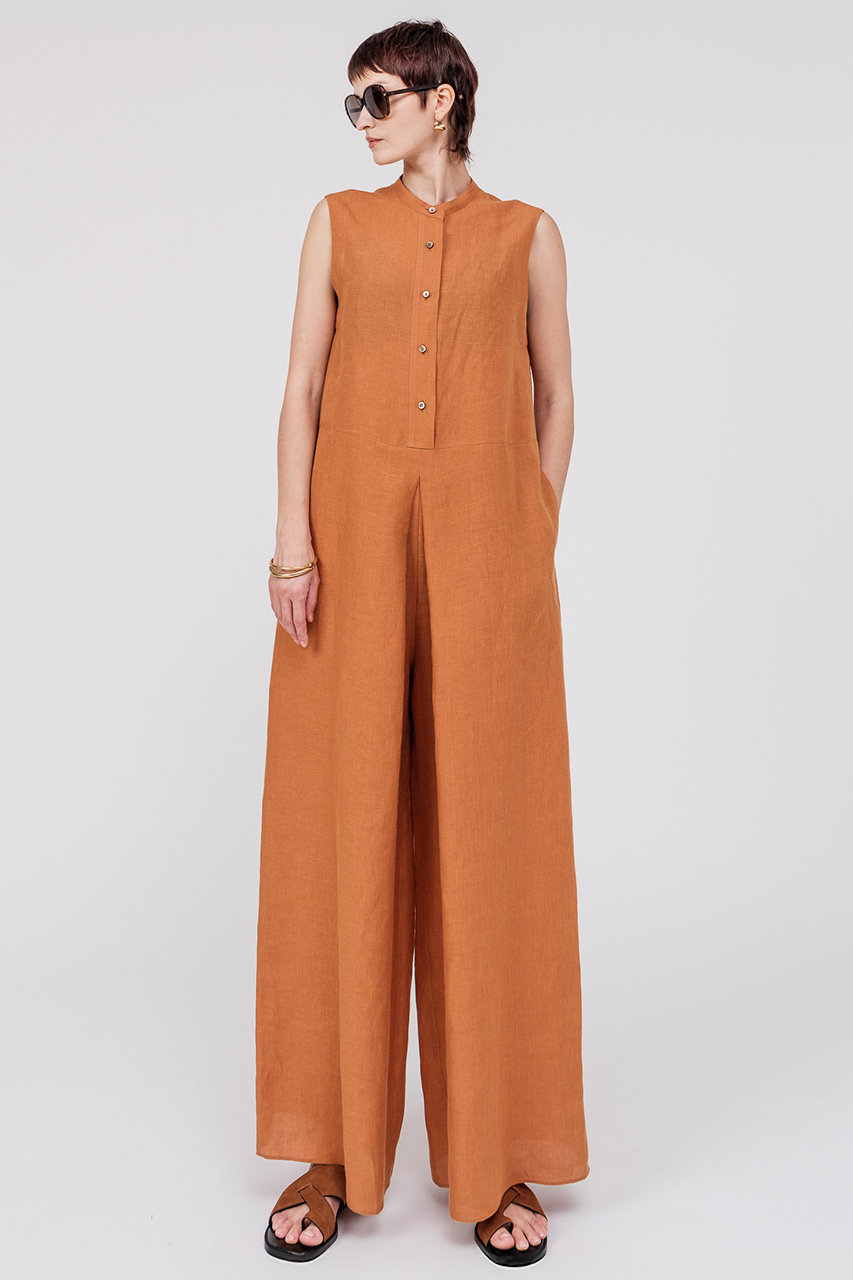 スタンダードなバンドカラーに、タック入りのワイドパンツを組み合わせたモード感漂う大人のジャンプスーツが登場。1858年創業のベルギー・LIBECO-LAGAE社製のリネン素材を使用。発色の美しさとソフトな風合い、そしてリネン本来の優れた耐久性を兼ね備えた素材が魅力。1着で涼やかに着こなせ、盛夏にも快適な一着です。