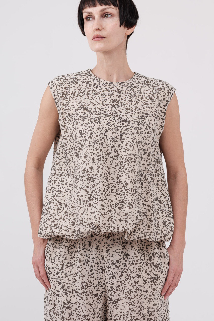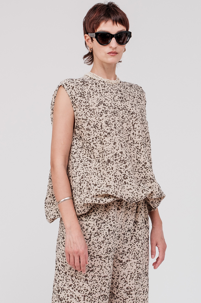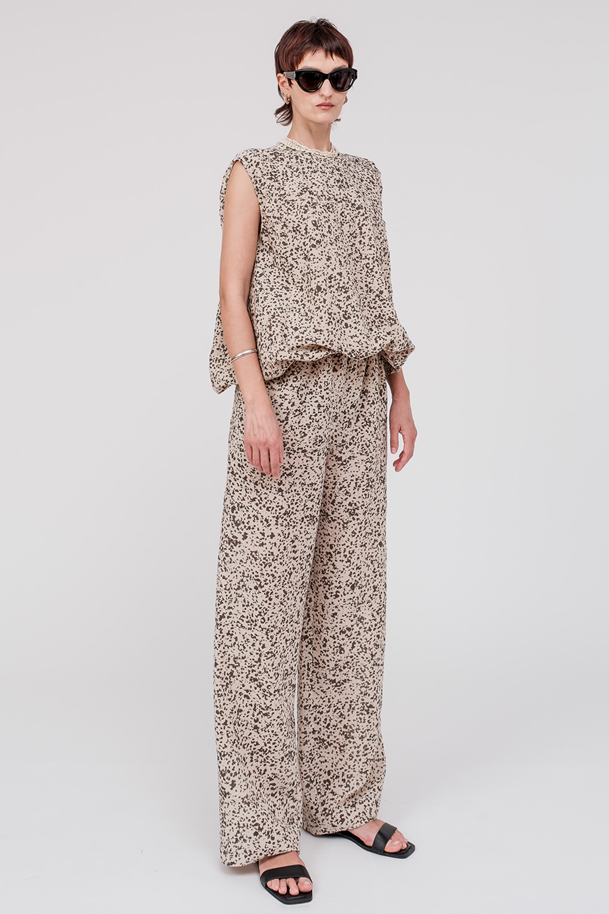 大地に舞う自然のかけらを思わせる、オーガニックなムードの抽象柄。リネンコットンのドライタッチで軽やかな生地感は、夏の定番にぴったりな1着。バルーンシルエットのスリーブブラウスは、裾がゴム仕様のためお好みで調節が可能。パンツは、すっきりとしたセミワイドのストレートラインに、ウエストはゴム仕様で快適なはき心地。セットアップで合わせると、爽やかでモダンな夏のスタイルが完成します。