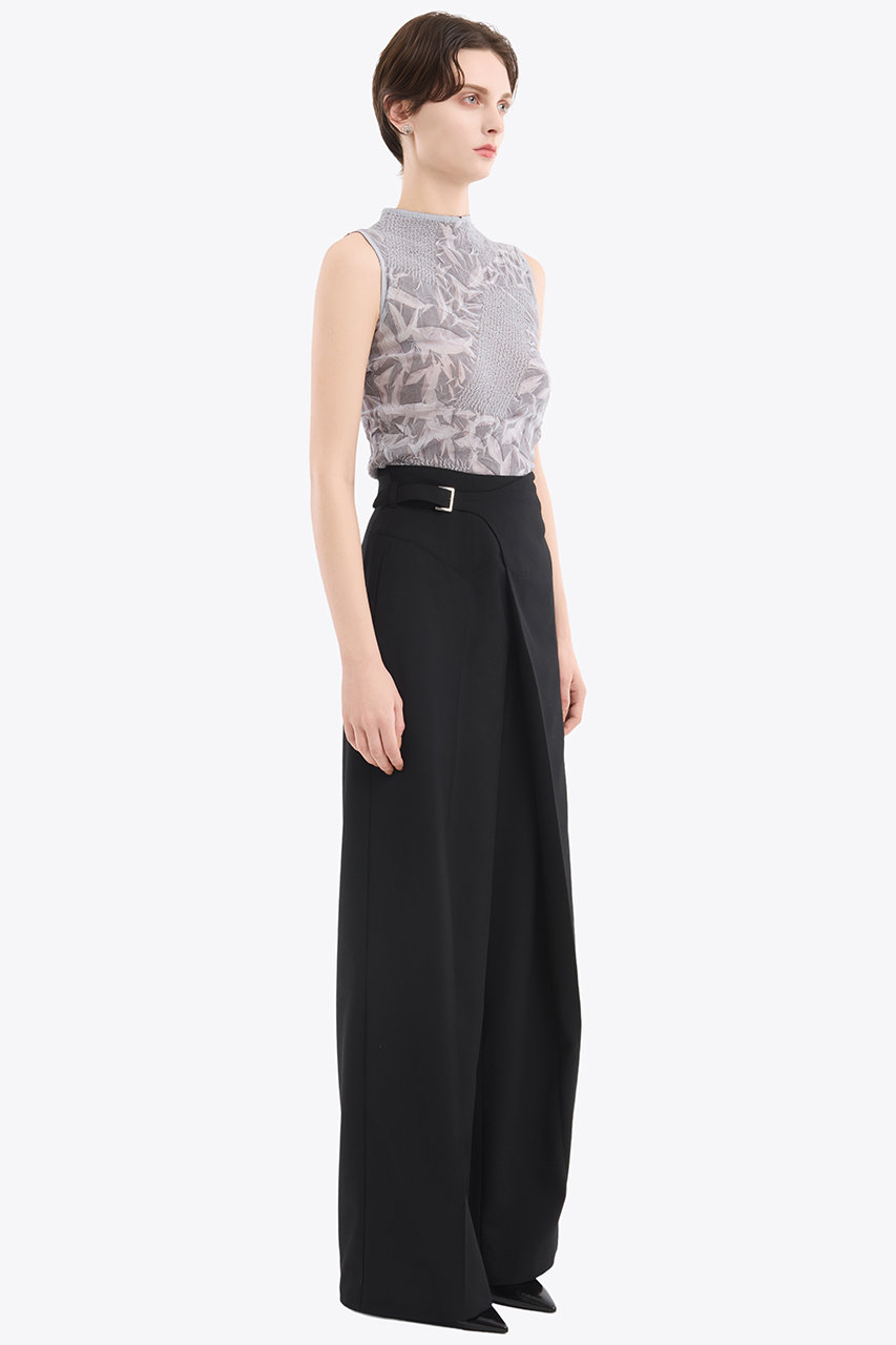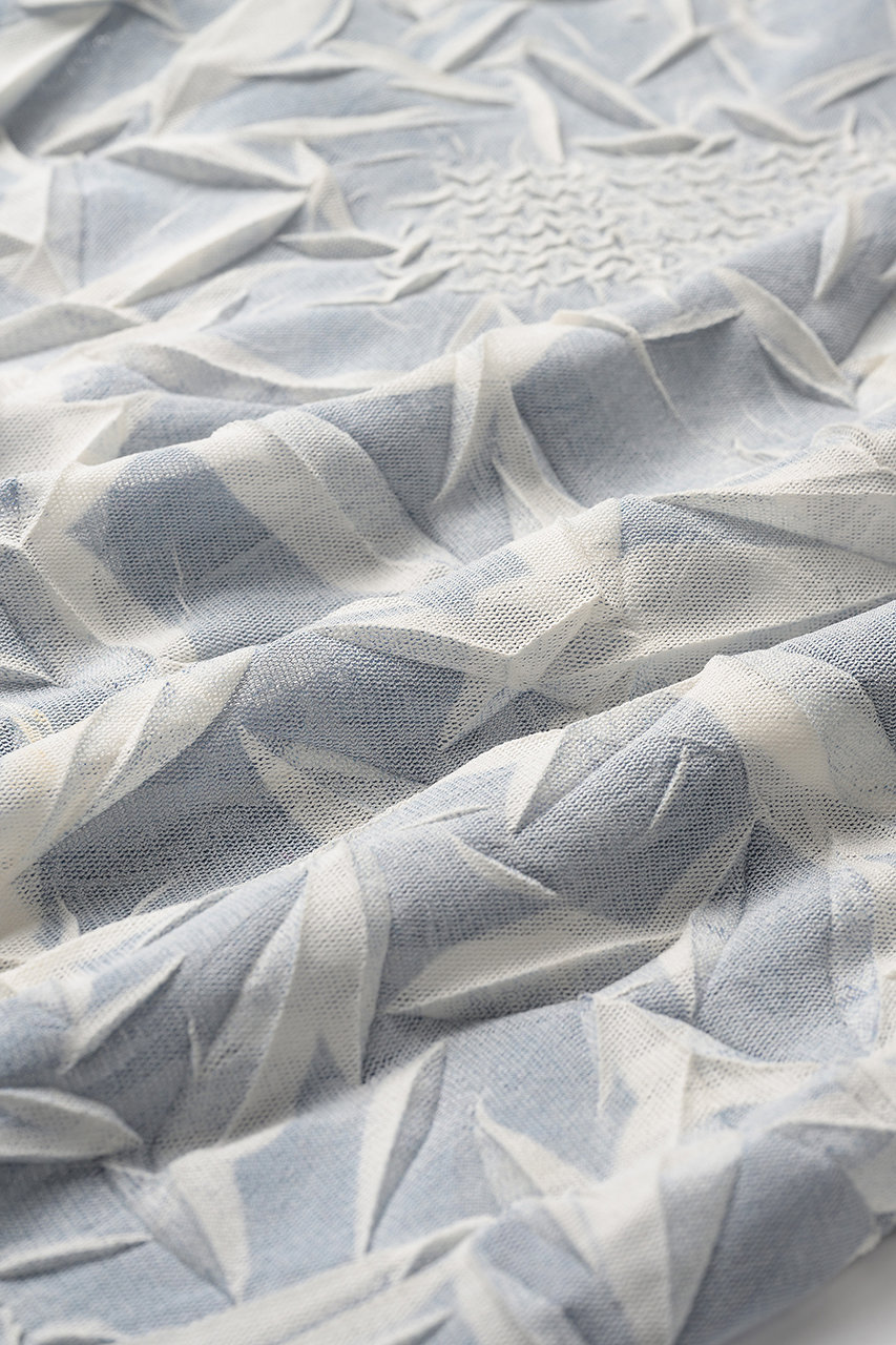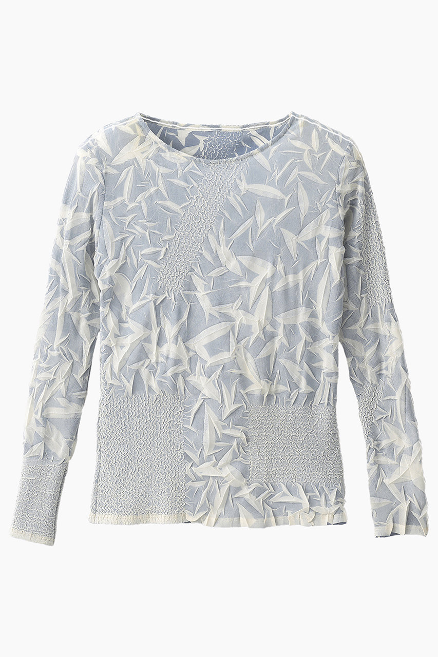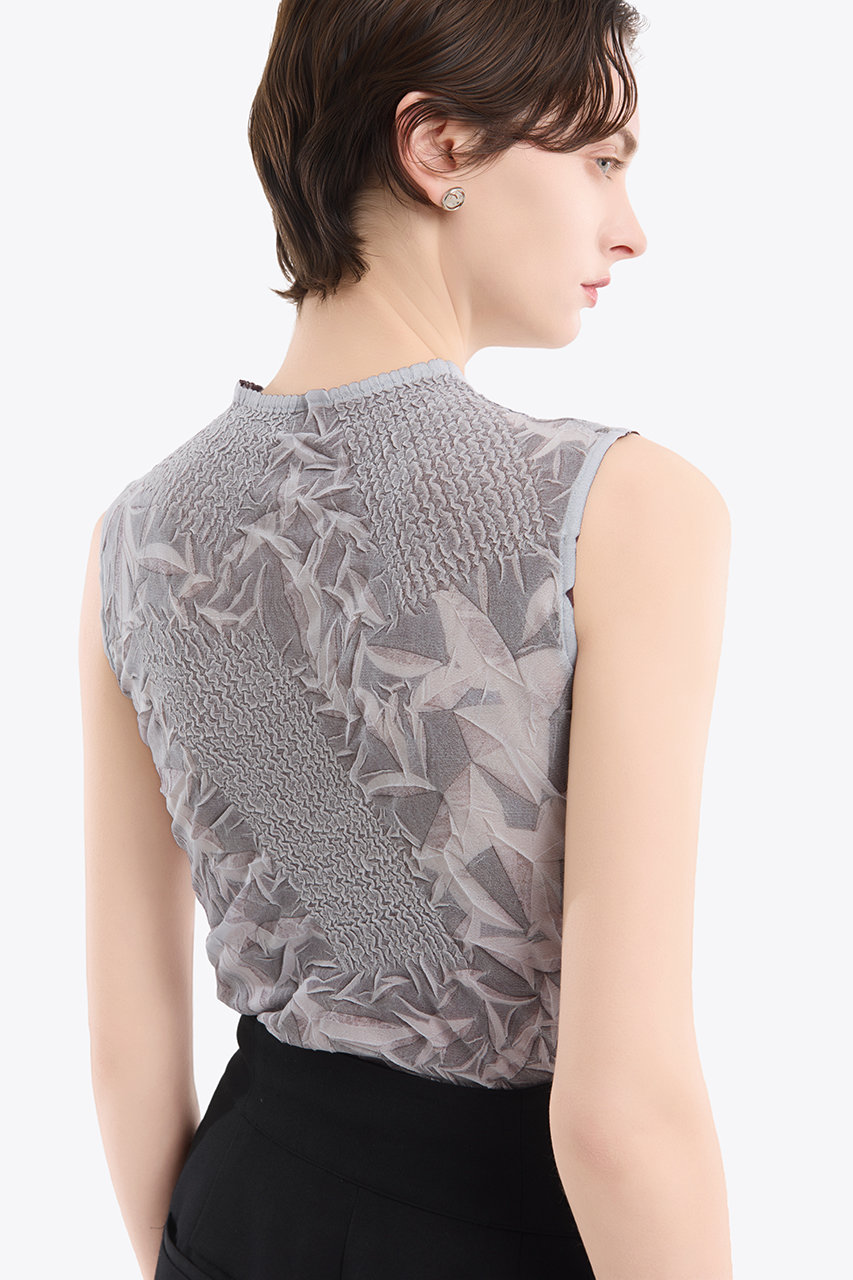 ブランドオリジナルで開発したプリーツ加工を用いたトップス。熱で縮む特殊なシートを使用し職人の手によりランダムなプリーツを表現。プリーツによる生地の凹凸が出来た後にプリントを乗せる事で奥行きのあるグラフィカルなプリーツのデザインに。ノースリーブのトップスは、独特な柄感を生かしてレイヤードにも最適。やや詰まった襟は軽さの中にも重厚感を生み出してくれそう。