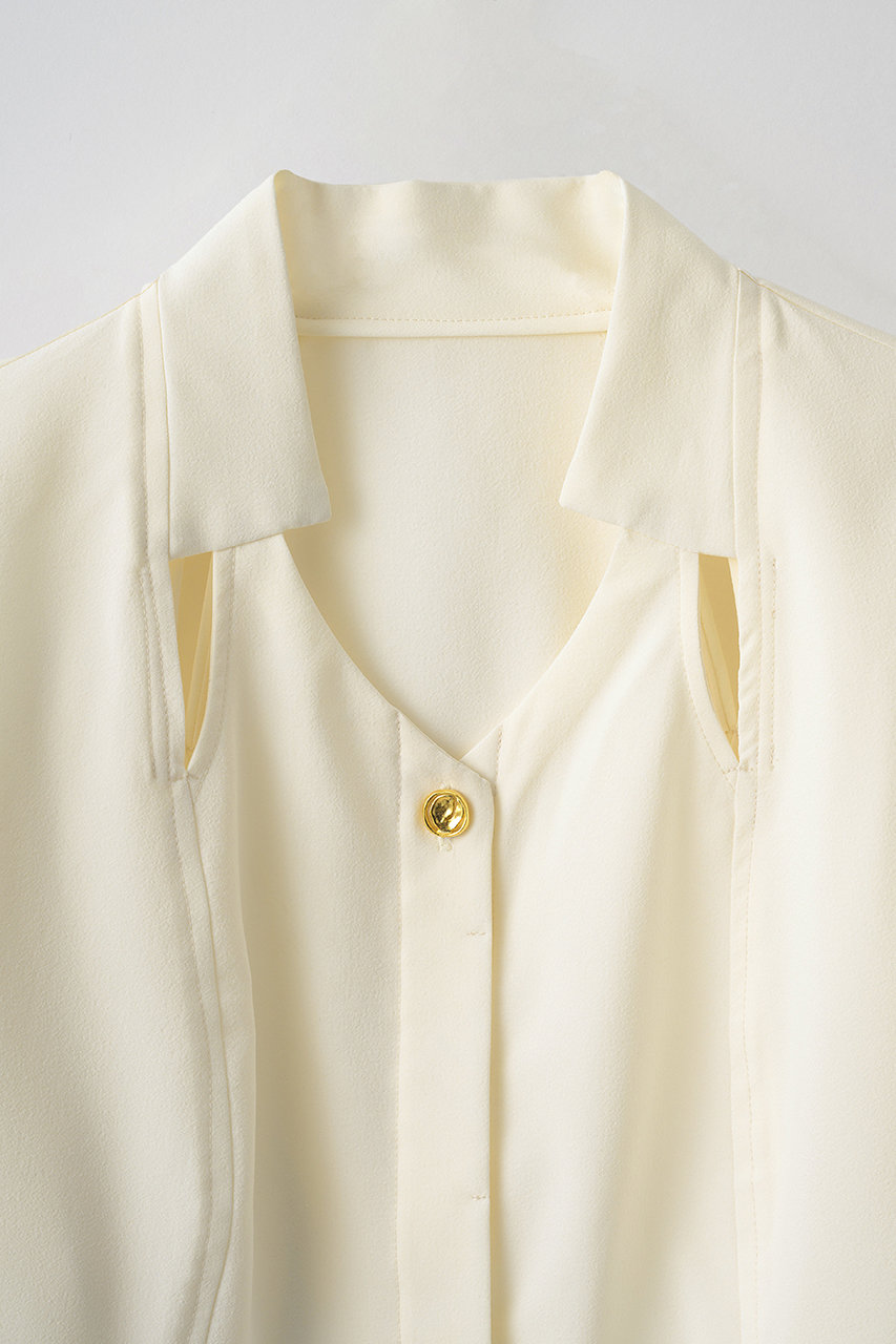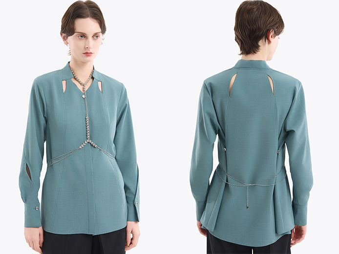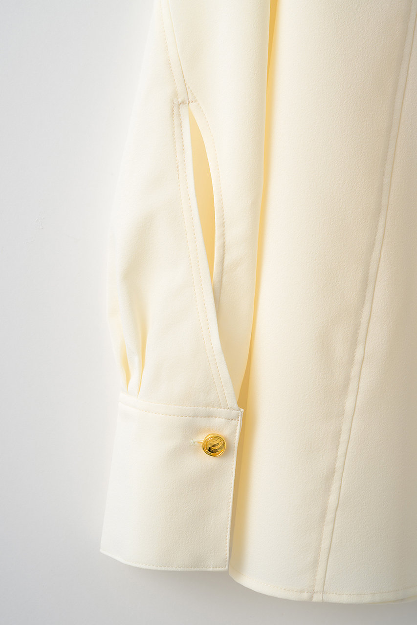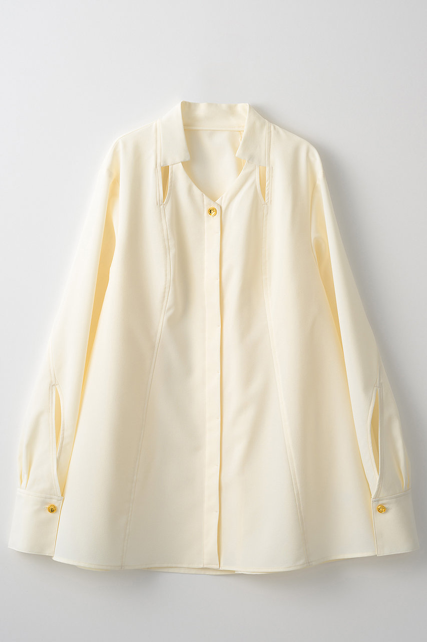 スラッシュディテールが特徴的なシャツ。デコルテ部分のカッティングは首まわりに抜け感をもたせ佇まいを優雅に演出。素材にはシック&シンの糸を使用し適度なメランジ感を表現。