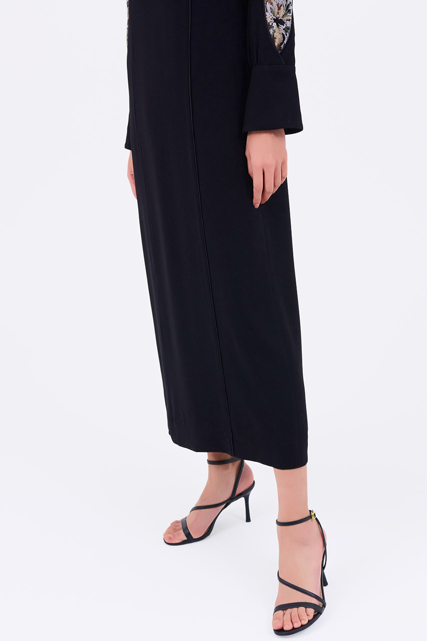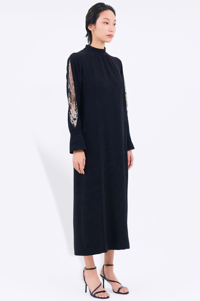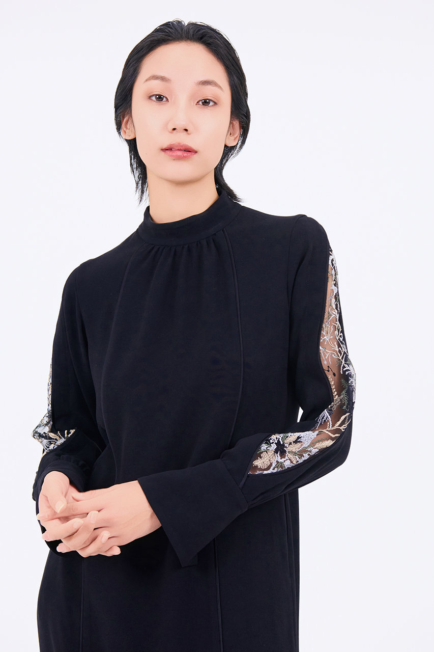 国産のエンブロイダリーレースを使用したドレス。ブランドのフィロソフィーが反映されたエンブロイダリーレースの豊潤なアーカイブの中から、デザイナーが訪れた雪化粧の景色をテーマにした刺しゅうレースを採用。雪で彩られた木々や花々、一つ一つが繊細で儚く凛とした表情を映し出す。蕾のようなカッティングが愛おしいペタルスリーブには、奥からエンブロイダリーレースを差し込む事で袖に立体感を演出。シルエットは穏やかな佇まいのストレートシルエットで仕上げ、土台生地には発色に優れたアセテート素材を使用。オケージョンシーンや特別な日に最適な1着。