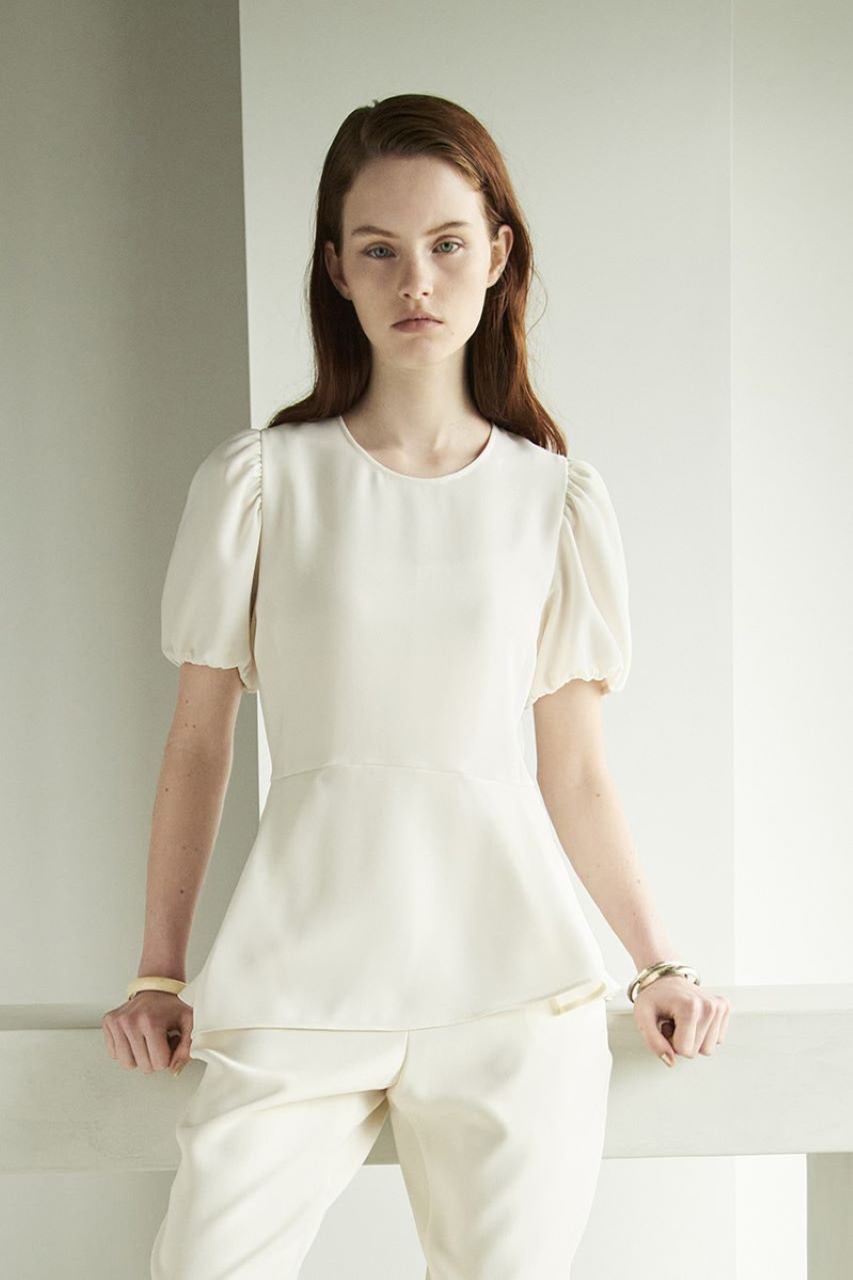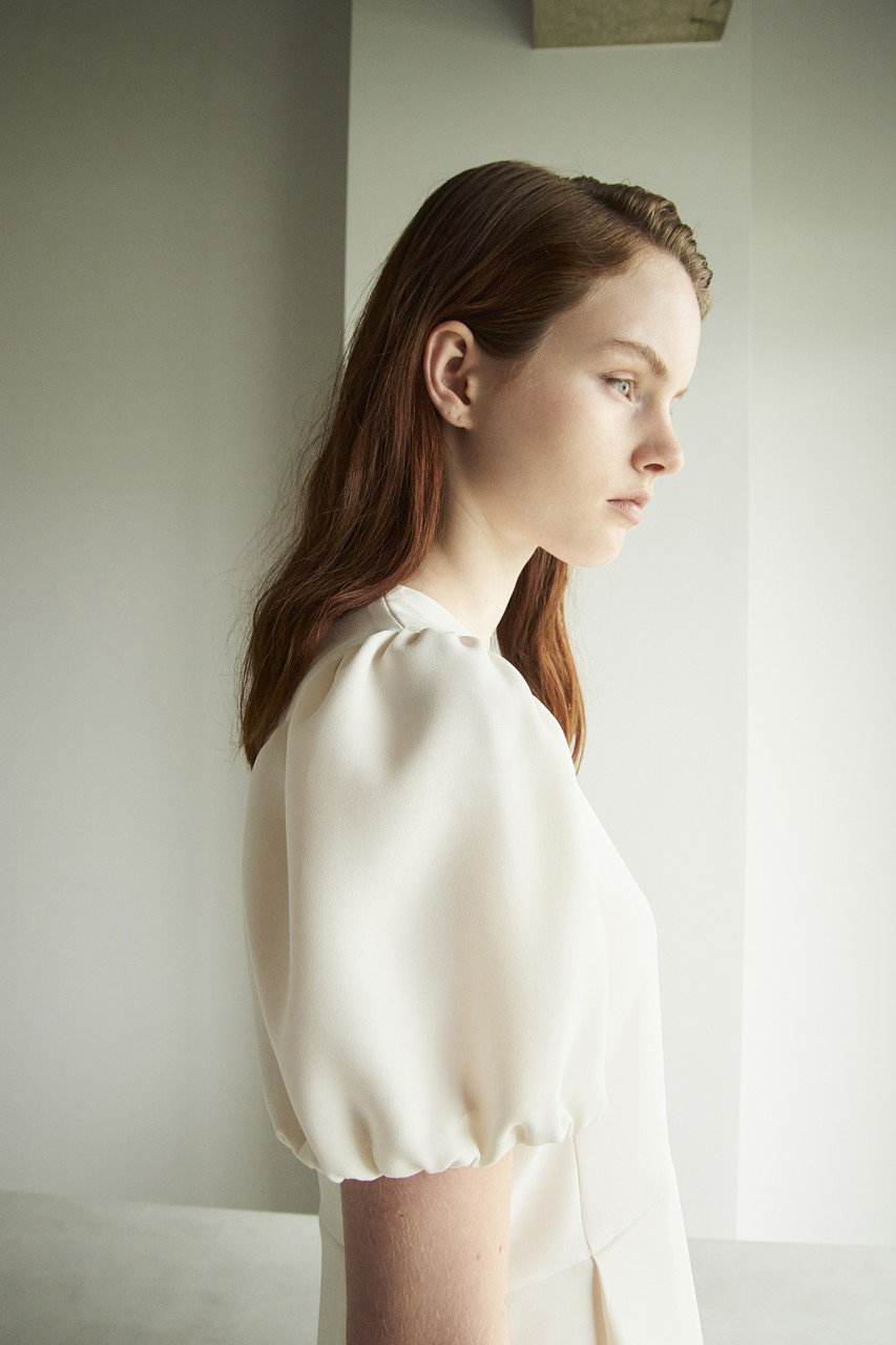 袖山にギャザーを入れたパフスリーブがフェミニンなムードとモード感を演出するブラウス。ペプラムデザインがスタイルアップしつつ、大人レディな雰囲気に。裾切替は、タックを施したアシメントリーデザインで個性をプラス。ナチュラルストレッチのポリエステルとトリアセテートの特殊複合の二重織り生地で、シワになりにくく、上品な光沢感と落ち感も魅力。