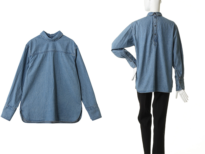大人カジュアルなデニムシャツを、洗練されたモダンな印象へアップデート。シンプルなスタンドカラーが顔周りを引き締め、後ろネックのボタンがバックスタイルを彩ります。サイドスリットが描くニュアンスで、ボトムを選ばず幅広い着まわしが楽しめる一着です。