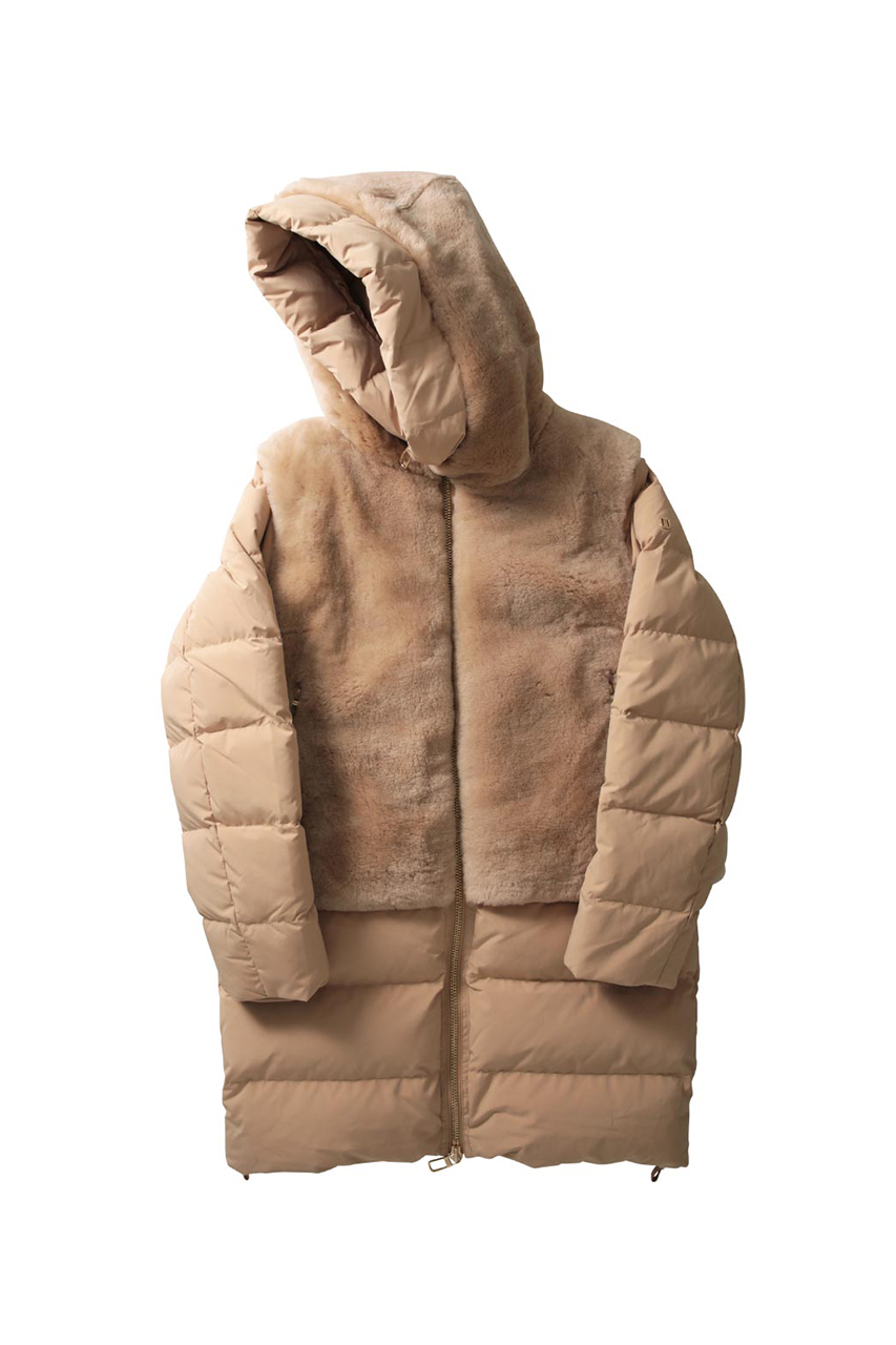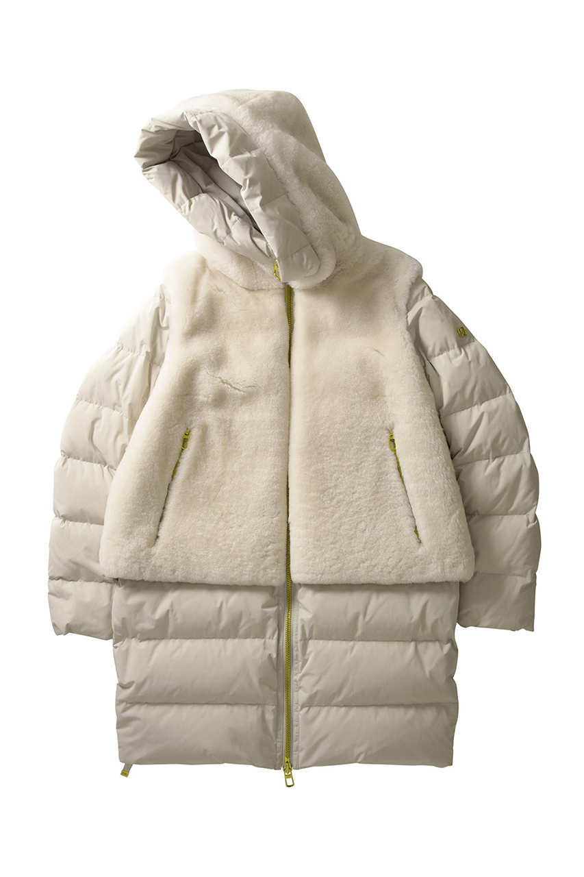 ムートン切り替えが特徴の“DEA(デア)”。今年は上品なベージュが新登場! 身頃からフードにかけてムートンを贅沢に使用。毛足の短いシープムートンはなめらかな手触りが魅力です。異素材をワントーンで組み合わせ、パーツカラーをゴールドにすることで高級感も加えています。全体のフォルムはスポーティーな要素を残しつつ、洗練された細身のデザインで、ダウンが苦手な方にもおすすめしたいアイテムです。
