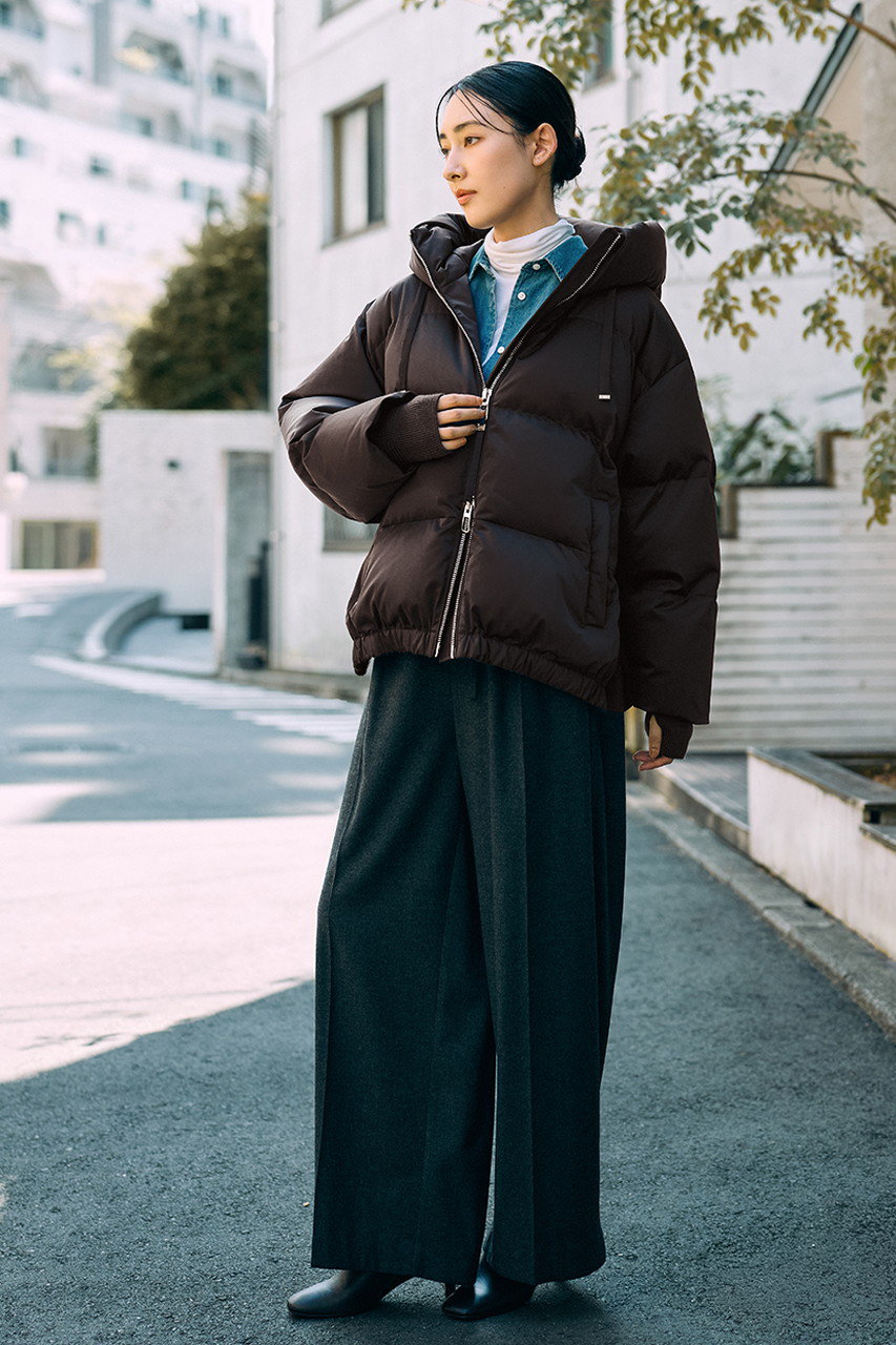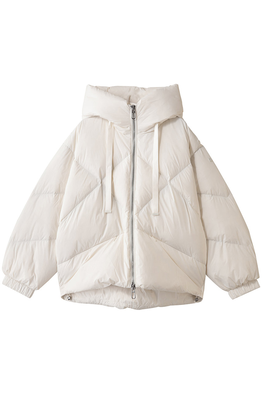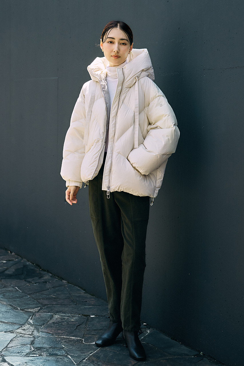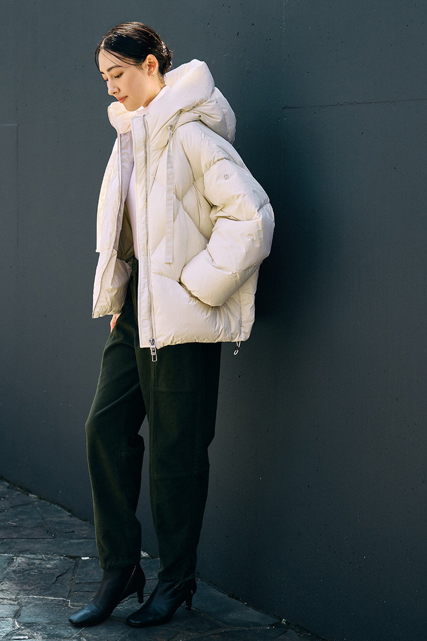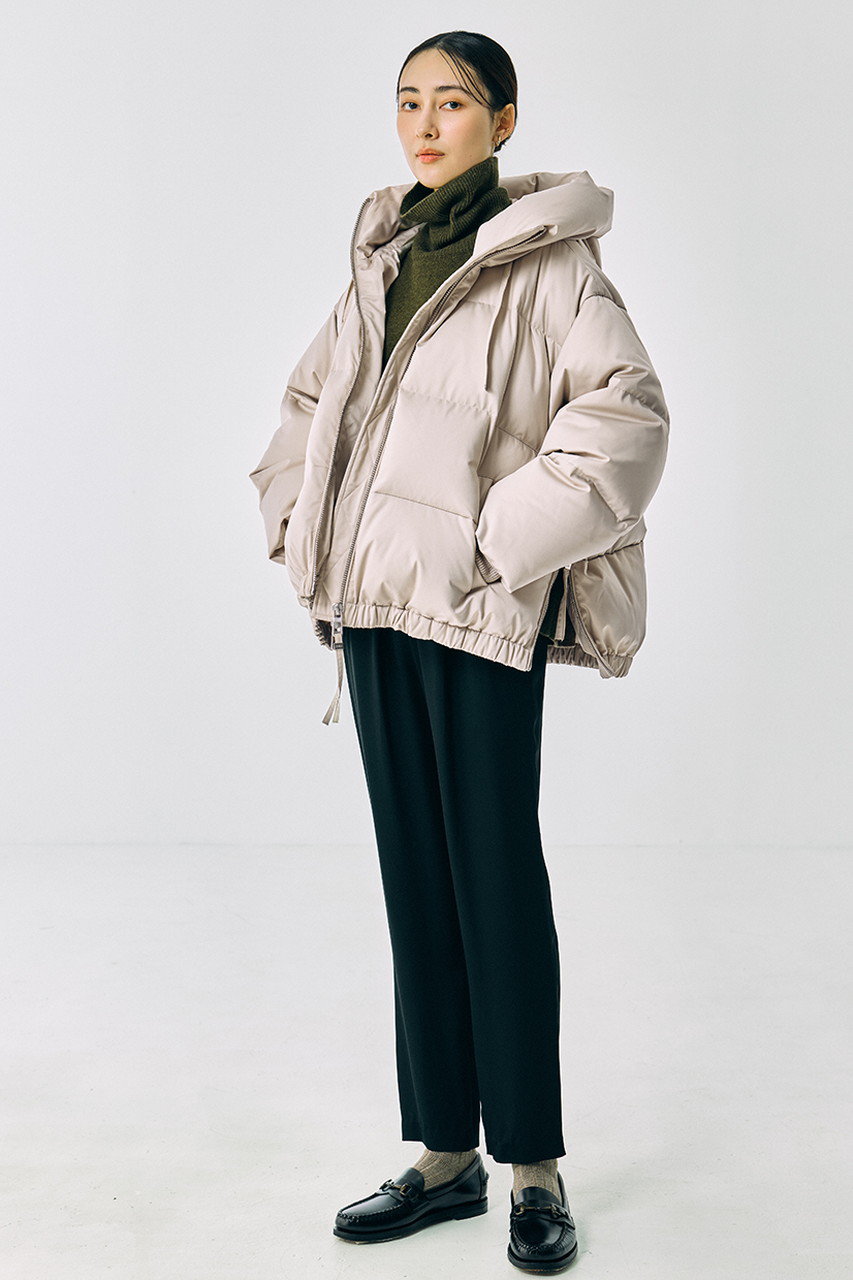 ショート丈と立体的なフード、丸みのあるドロップショルダーが女性らしさを引き立てるダウン。大胆なステッチが程よいアクセントに。シルキーな素材感と高い保温性で、きれいめからカジュアルまで活躍。