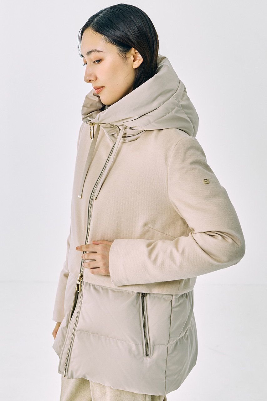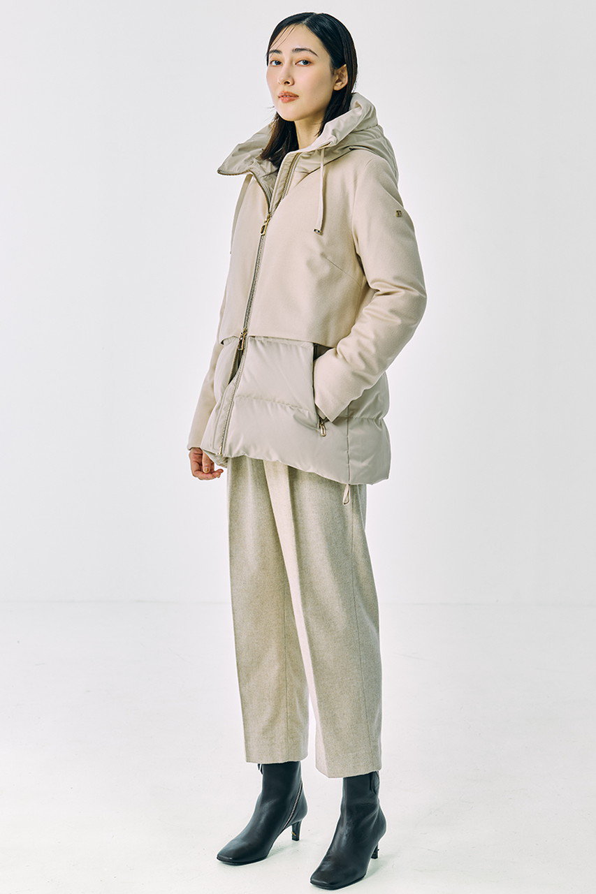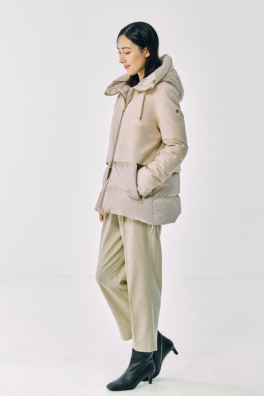 異素材切り替えで奥行きのある表情に仕上げたフーディダウン。マットなダウンに上質ウールを組み合わせ、軽さと暖かさはそのままに大人上品な印象へ。きれいめダウンをお探しの方にぴったりで、ロングシーズン楽しめるダウンコートです。