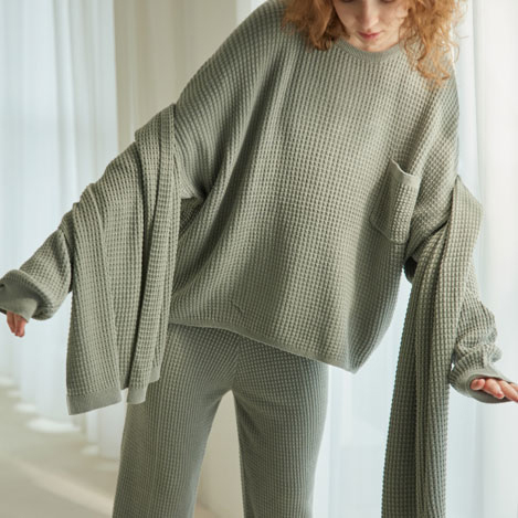 ふっくらとしたワッフル編みのニットは、やさしい肌ざわりと適度な厚みで、心までほぐしてくれるような着心地です。