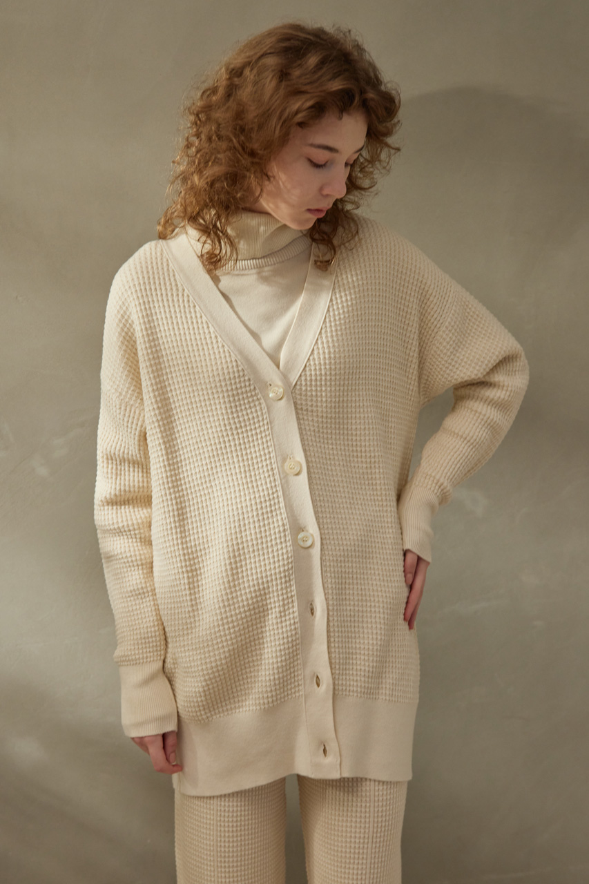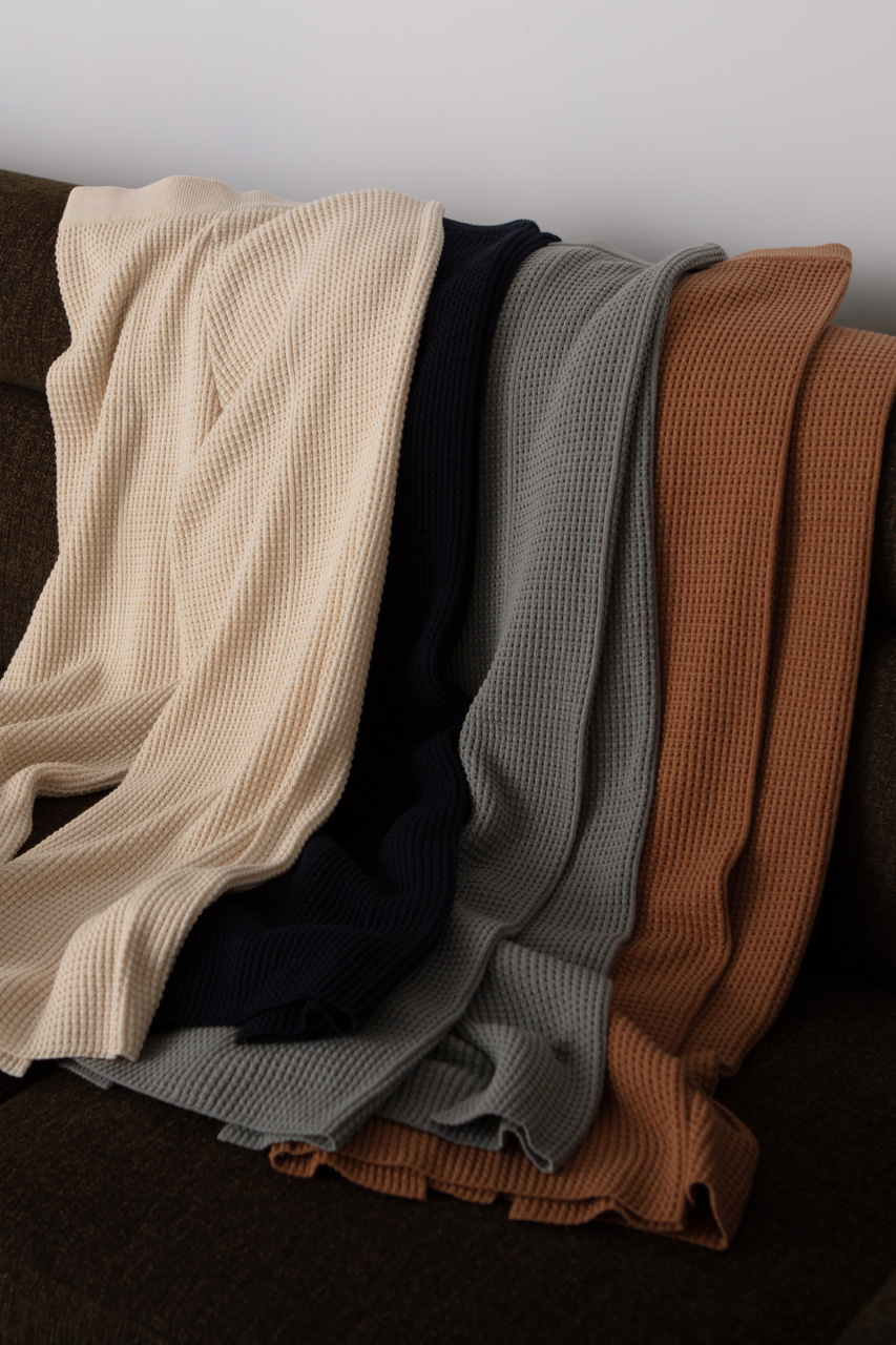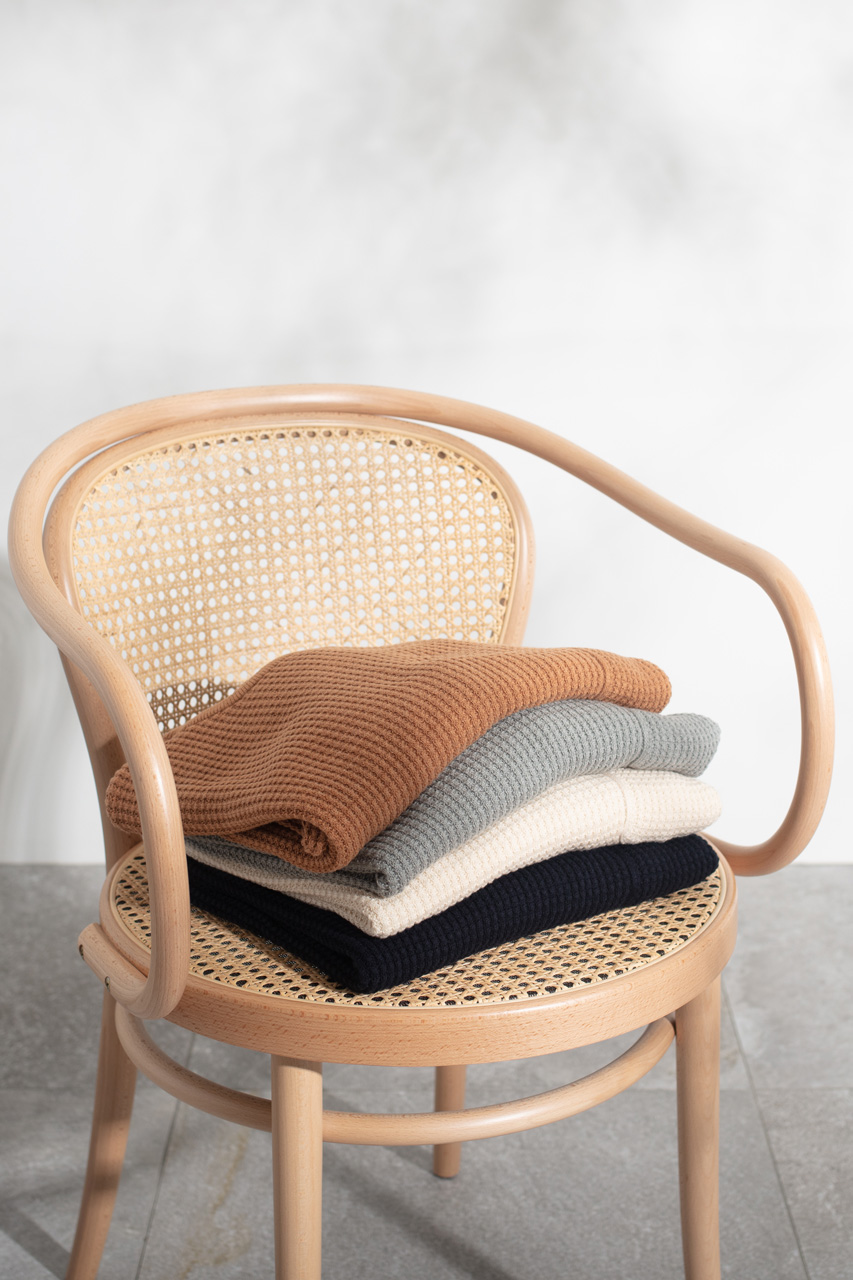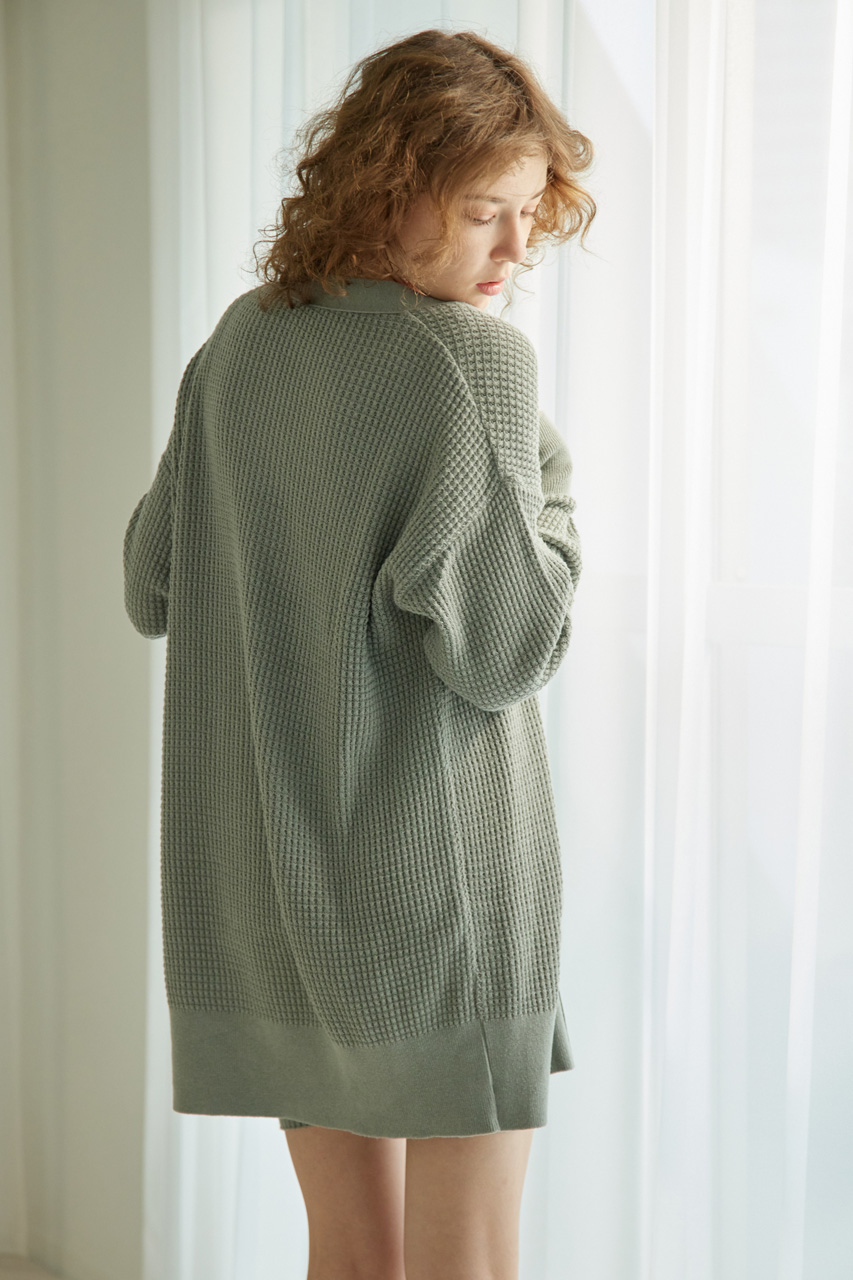 見た目以上に軽く軽やかなワッフル編みは、吸放湿機能に優れているため、羽織った瞬間から快適な着心地を実感できます。