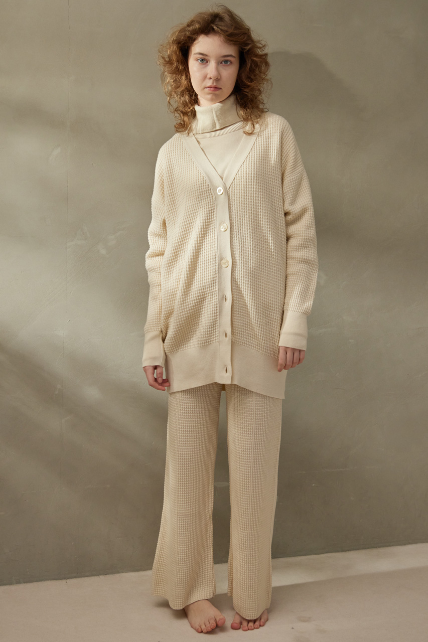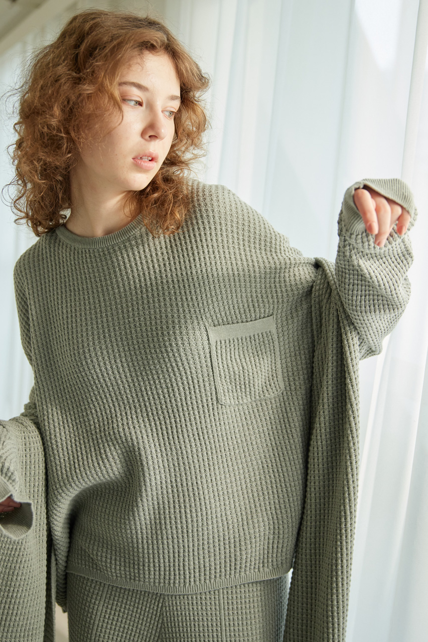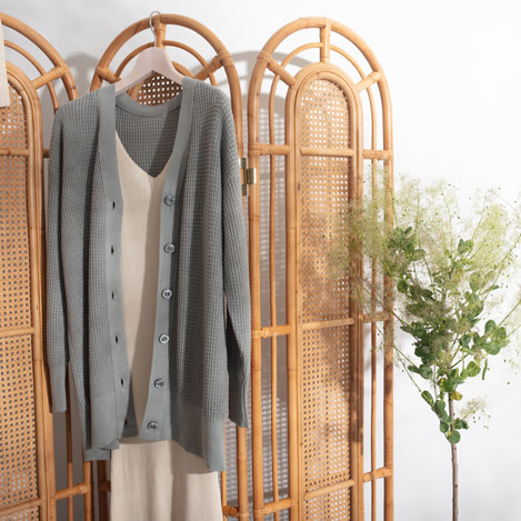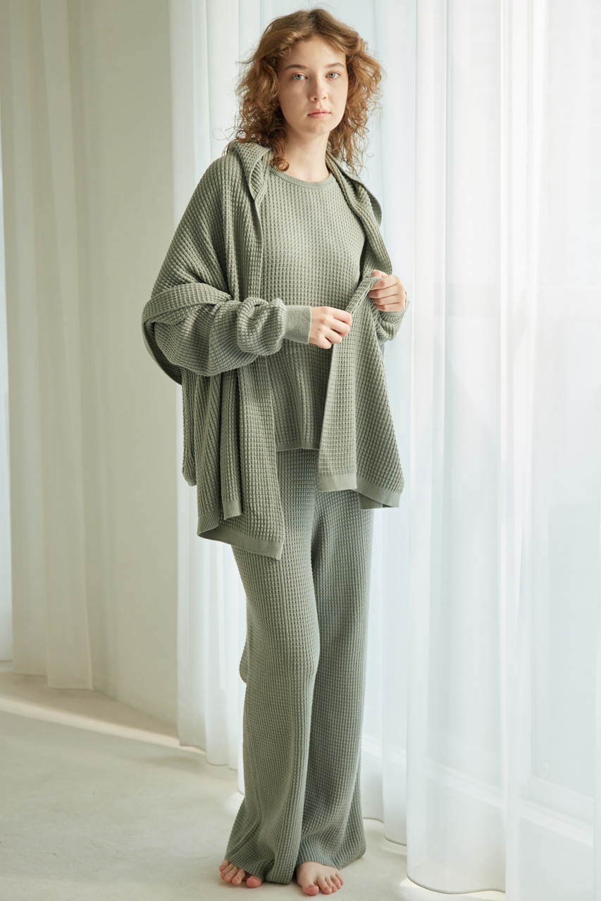 見た目以上に軽く軽やかなワッフル編みは、吸放湿機能に優れているため、羽織った瞬間から快適な着心地を実感できます。