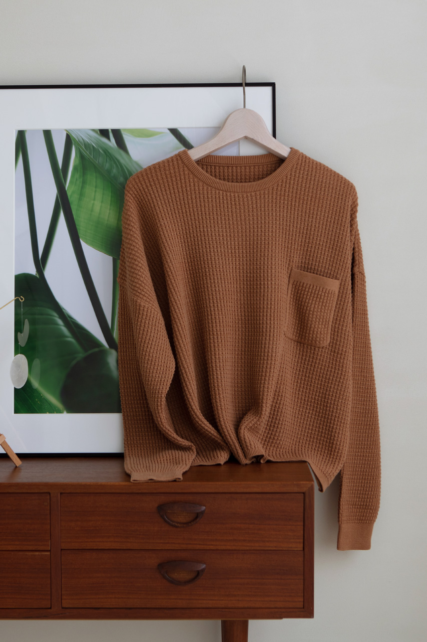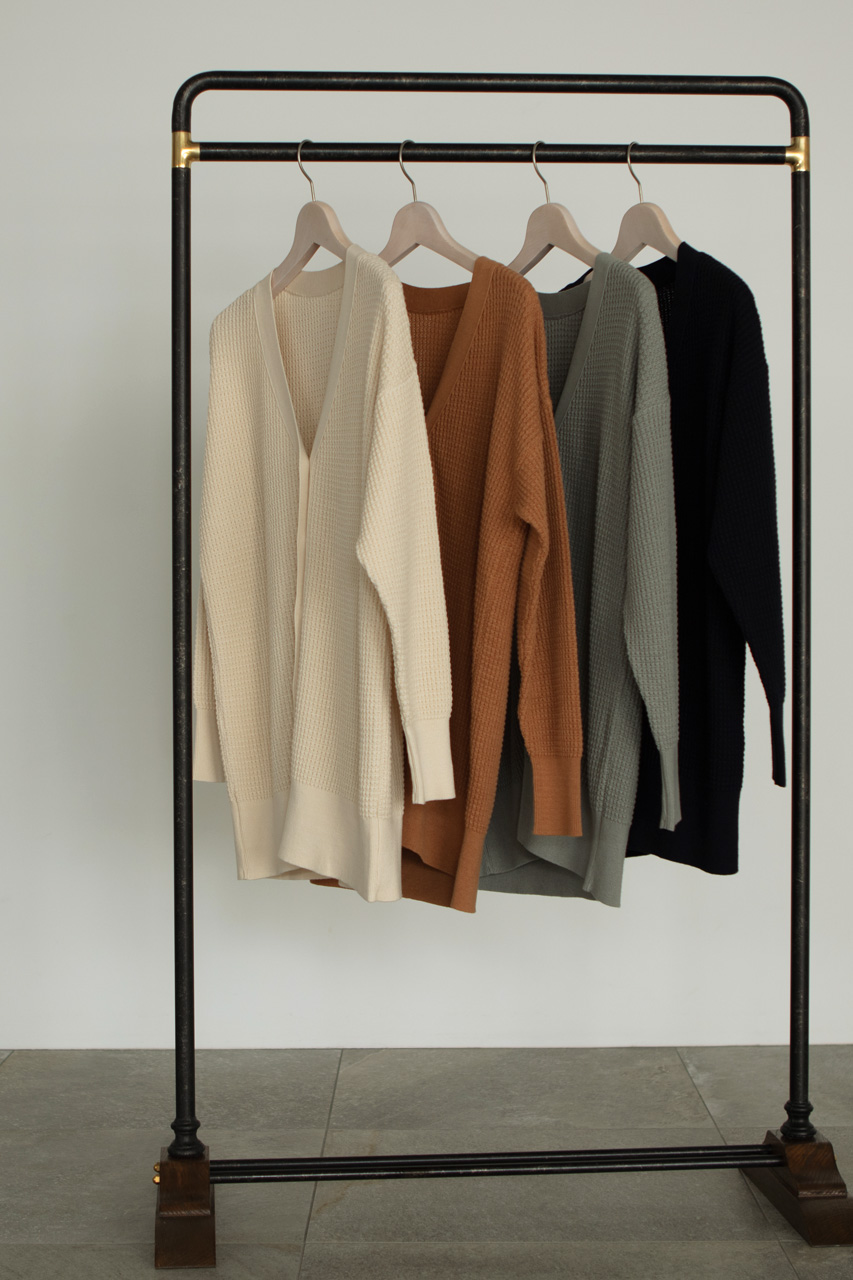 温かみのあるワッフル編みのニットは、ふっくらとした表情がありながらも軽やかで、今すぐ着られて春まで長く活躍する素材感が魅力です。