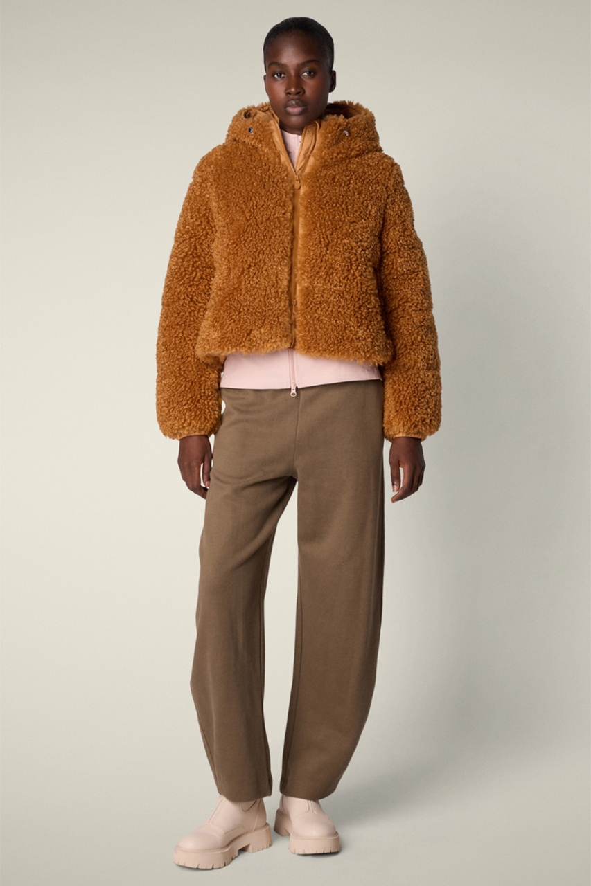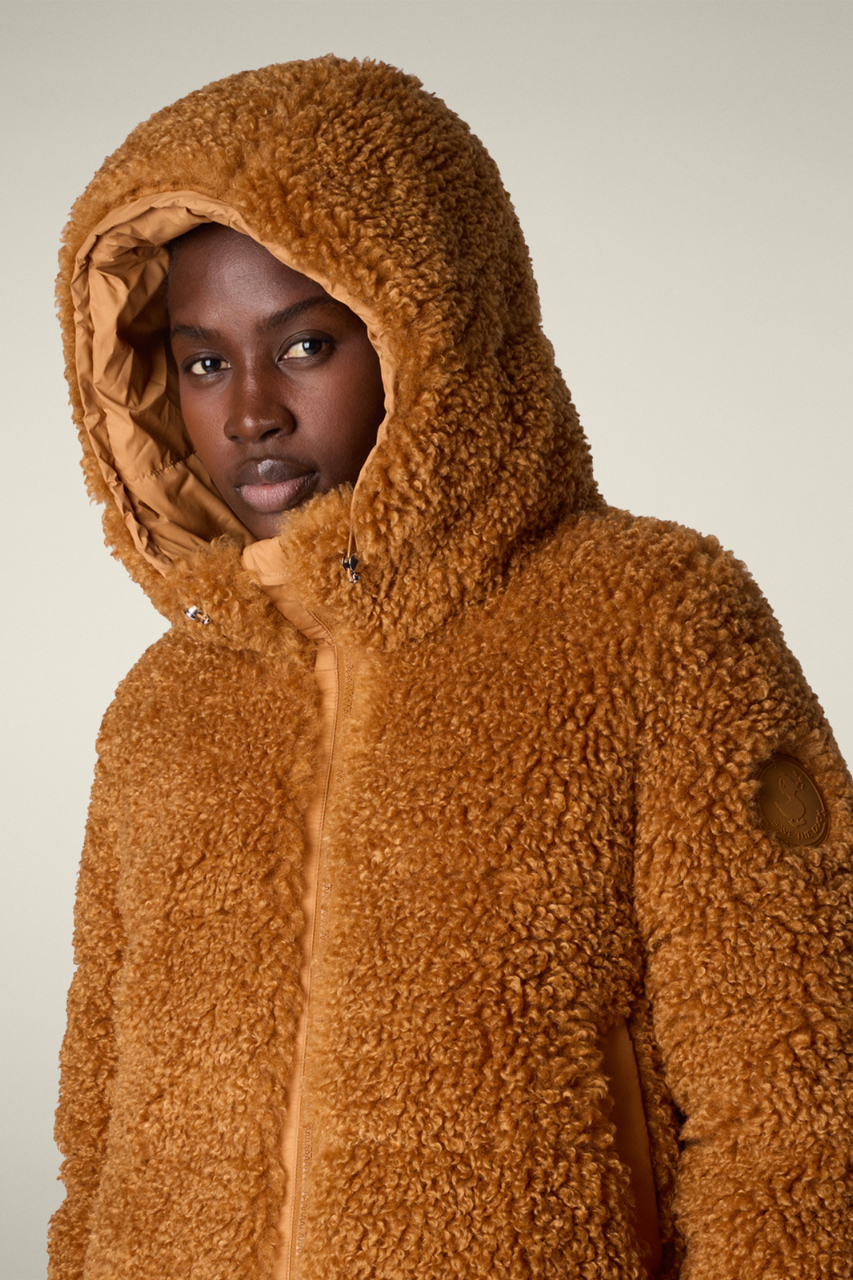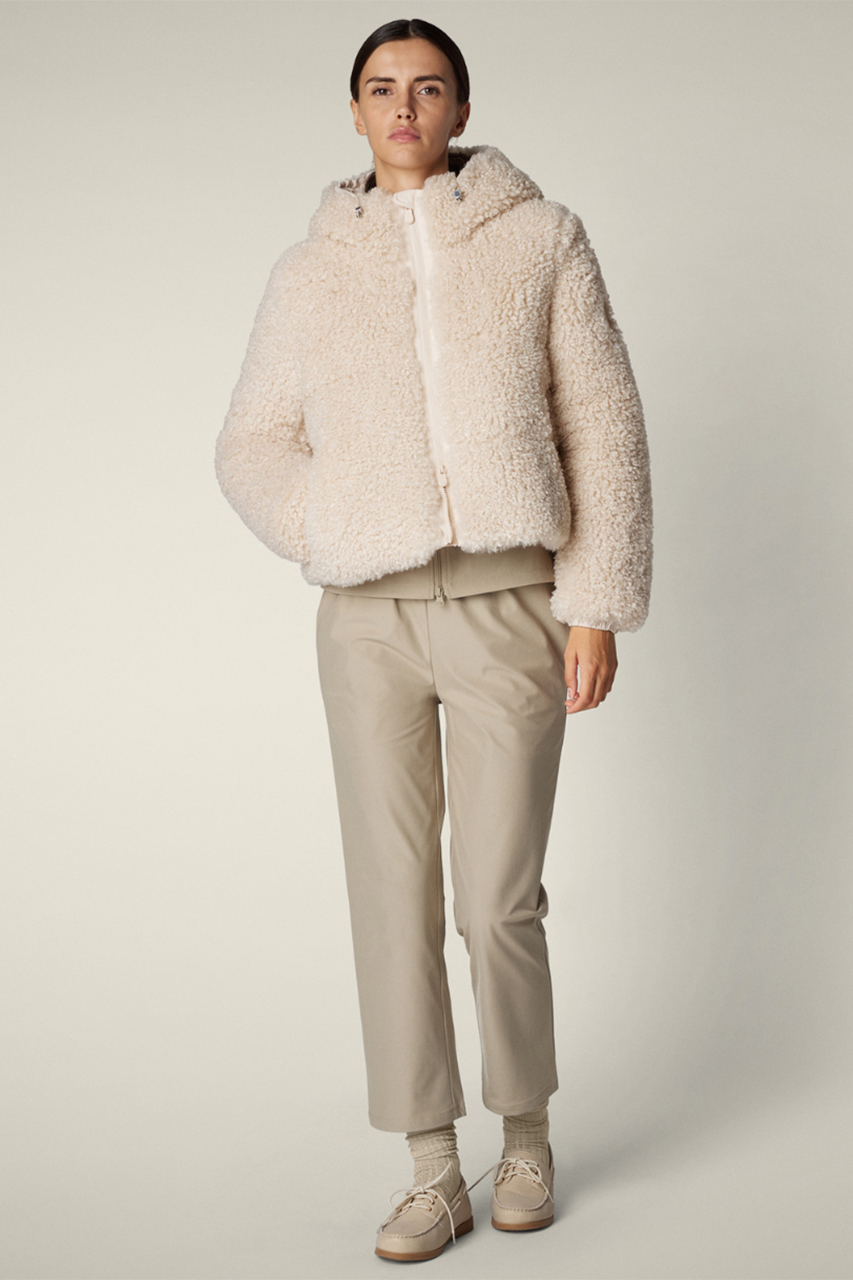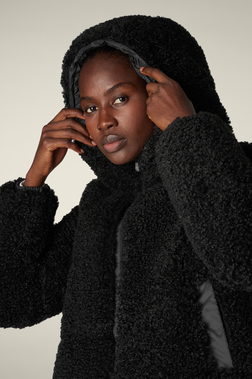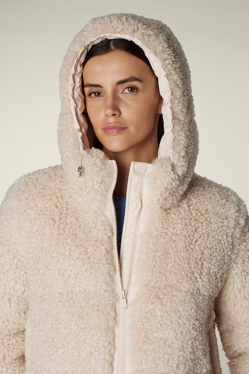 まるで本物かのようなふわふわのフェイクファー素材がラグジュアリーなムードを引き立てるショートコート。テディベアのような大きなフードが可愛らしさをプラス。優しさと妥協のないデザインがワードローブに心地よさをもたらしてくれそう。