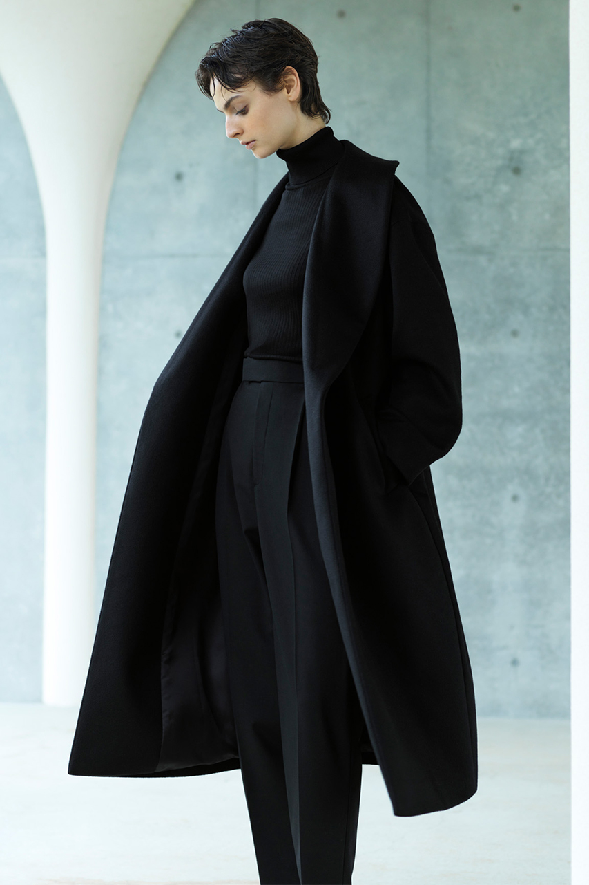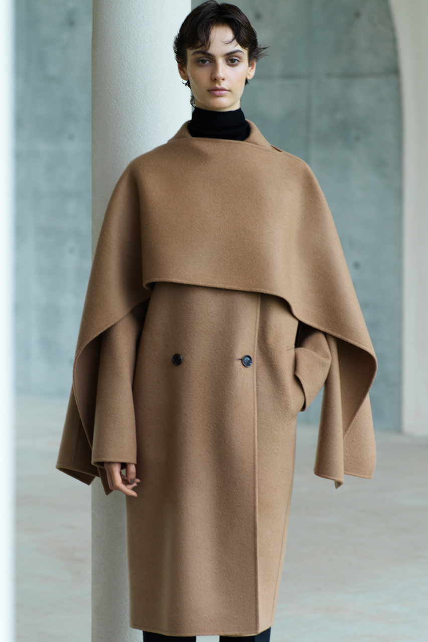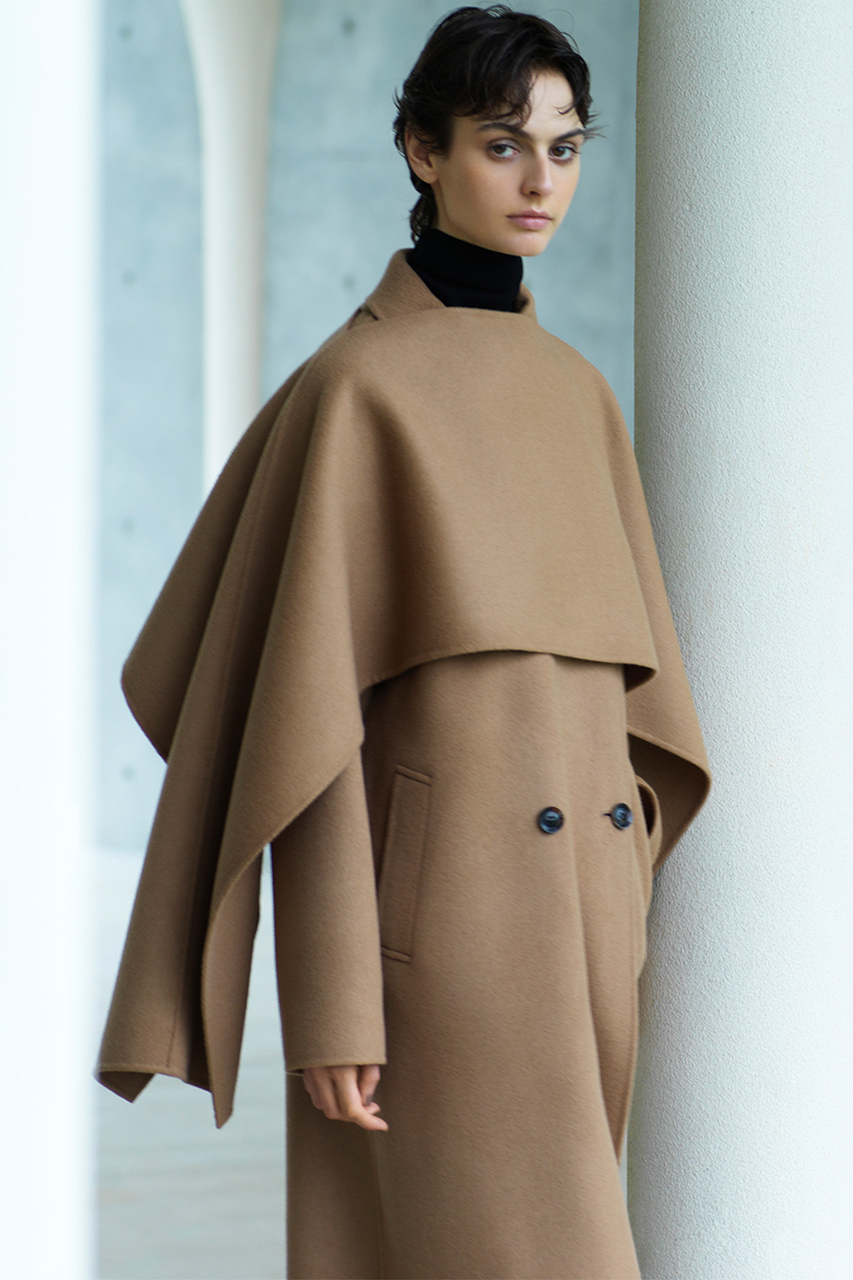 ケープを重ねた2wayデザインが、装いにドラマティックな表情を添えるケープコート