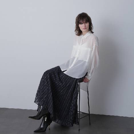 【hLM】新作のスカートはシアーなストライプ柄ジャカード生地で軽やかに仕上げたアイテム。女性らしいフレアシルエットとマニッシュなピンストライプ柄が大人っぽさを演出。軽すぎず今すぐから秋も活躍する1枚。キレイめなお出かけやパーティにもおすすめです。