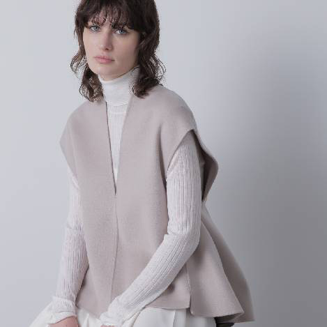 フルハンドメイドで仕立てられたペプラムデザインのジレブラウスは、高級ウール原料をベースにし、カシミヤタッチの質感と驚くほどの軽さが特徴のリバー素材を使用しています。合わせるインナーの厚さやデザインによって、長いシーズンに渡って幅広いテイストの着こなしを叶えてくれるアイテムです。