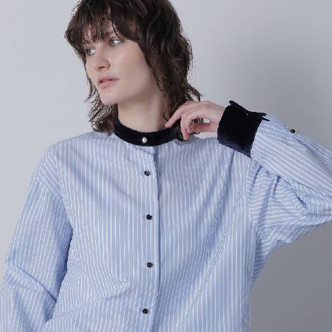 上質なコットンタイプライターにベルベットで切り替えたスタンドカラーがクラシックな心象のブラウス。