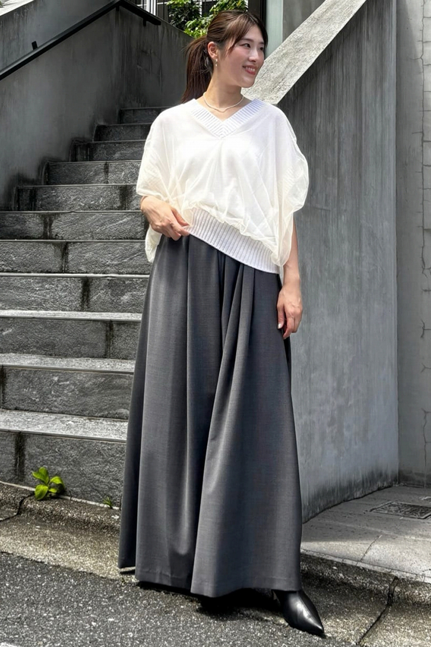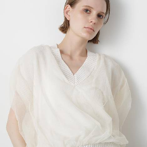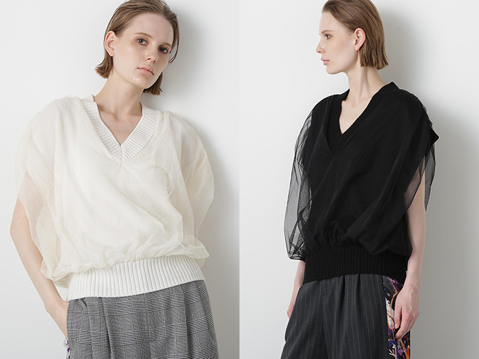 Vネックジレに、同系色の軽やかなポリエステルチュールを組み合わせたニット。