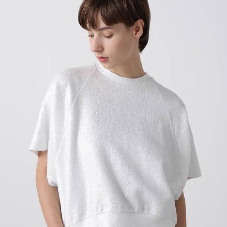 コットンのミニ裏毛のパイル面に箔プリントを施すことで、立体的で豊かな表情を生み出した素材感が魅力的な1着。