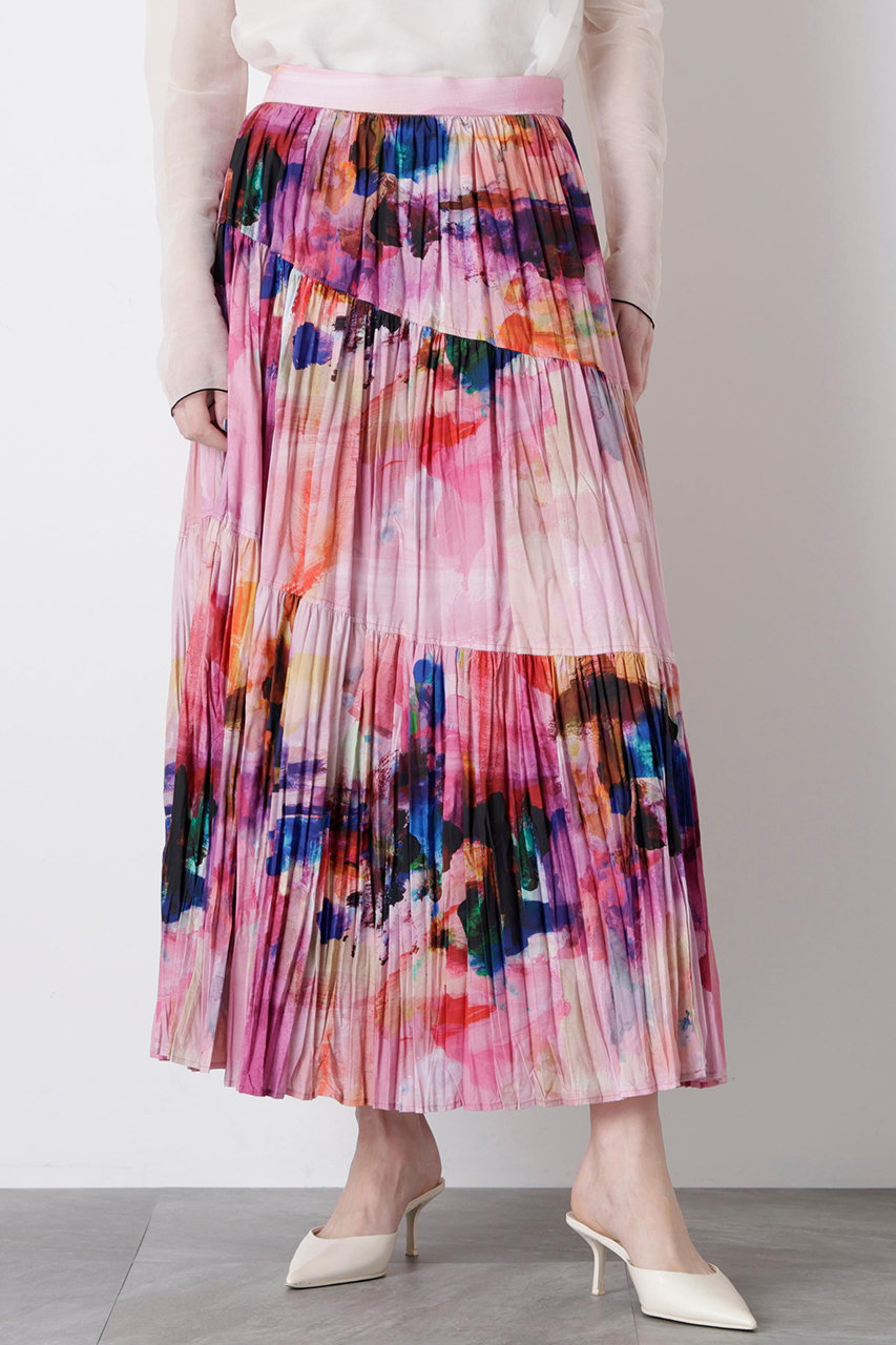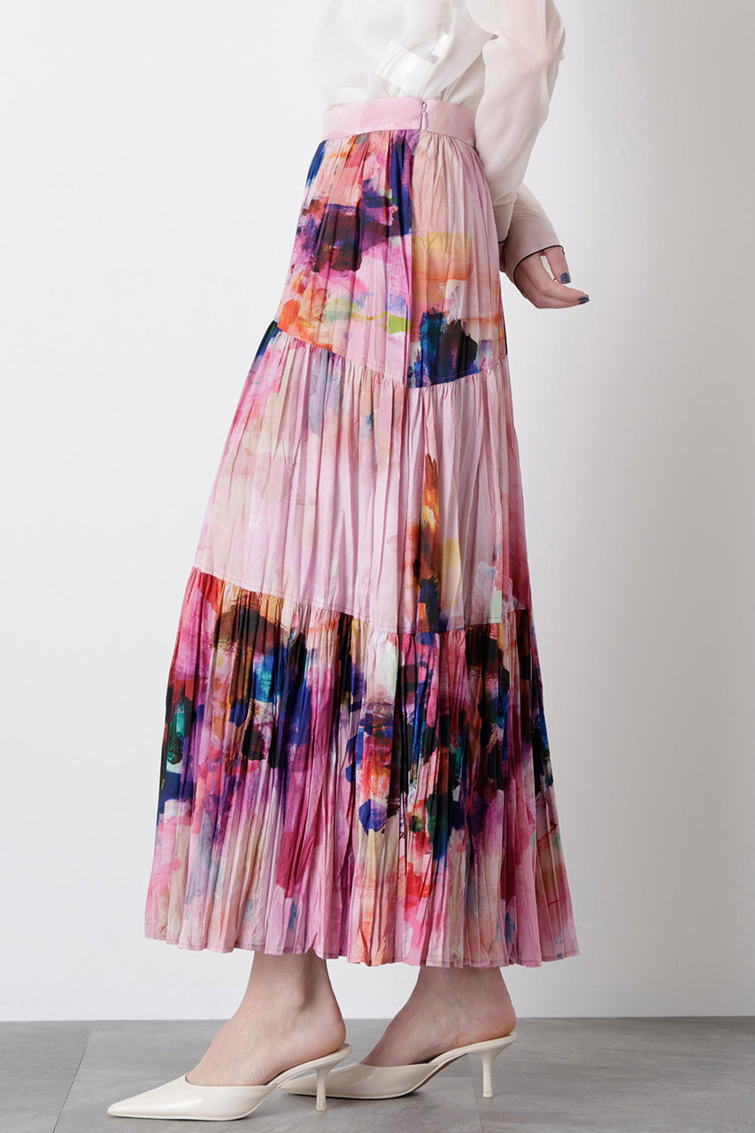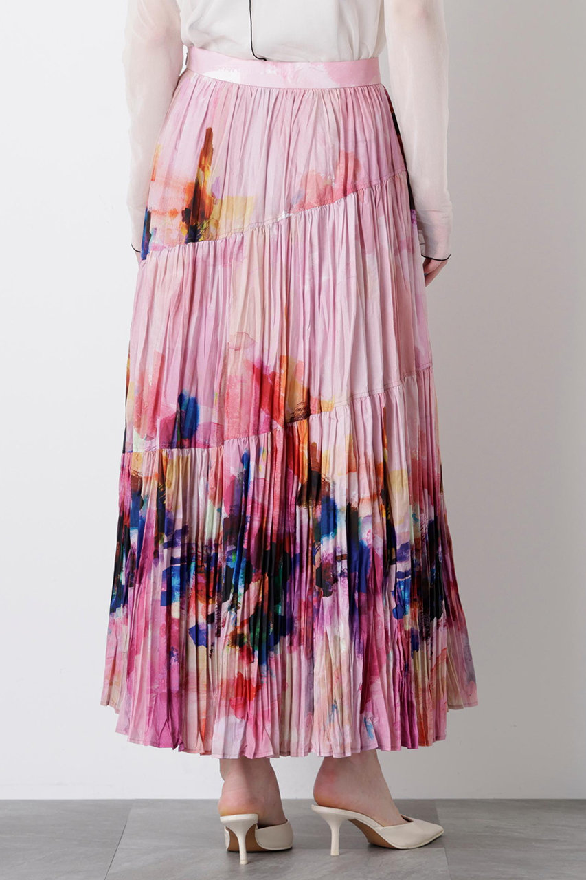 ポリエステルのタイプライター素材にプリーツ加工を施し、立体感を演出。左下がりの切り替えを用いた3段ティアードが柄の表情に奥行きを与え、動きによって美しい陰影が生まれそう。