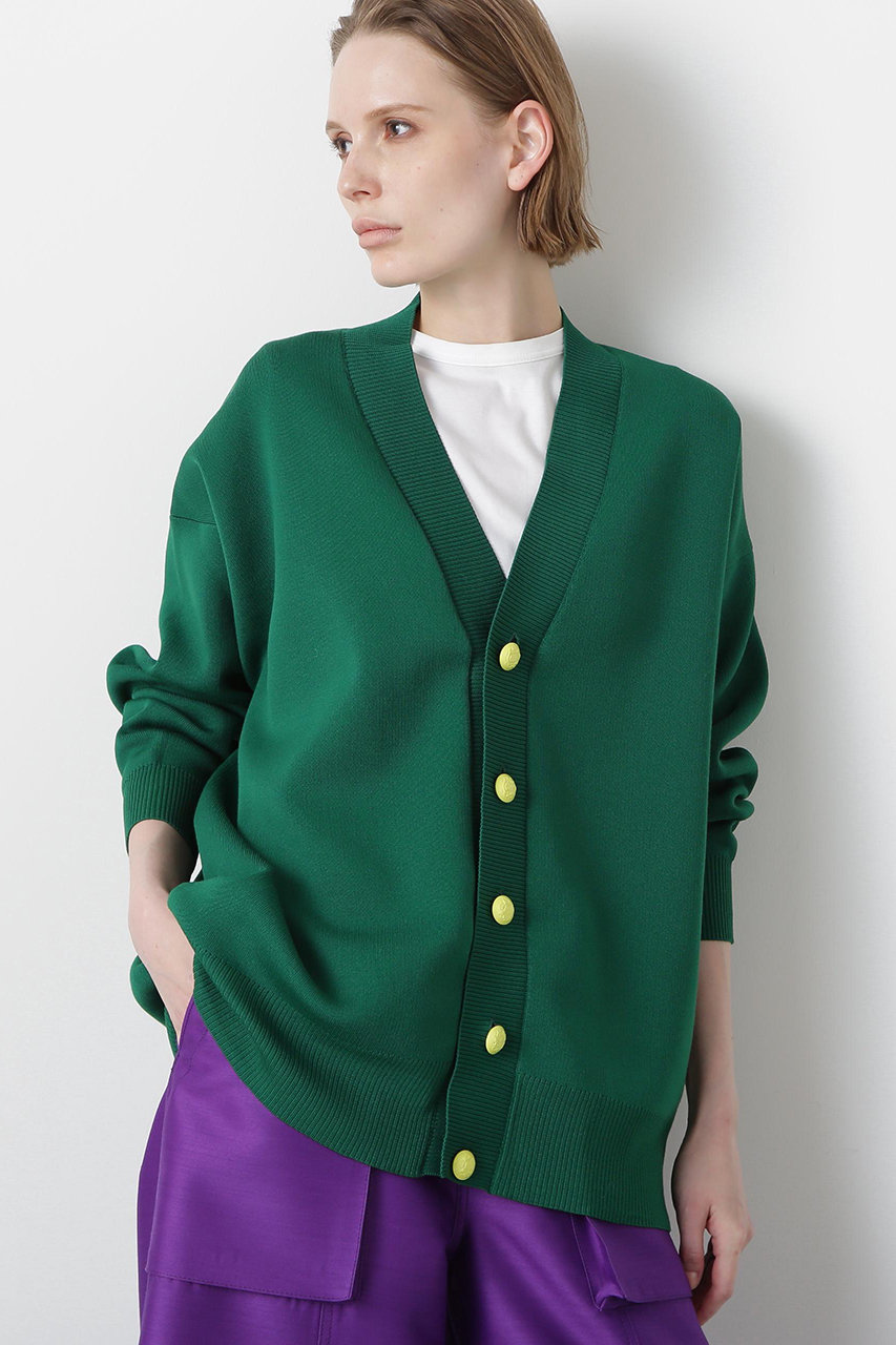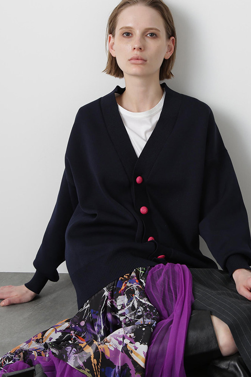 ゆったりとしたオーバーサイズながらも、シャープで洗練されたモード感が漂うニットカーディガン。