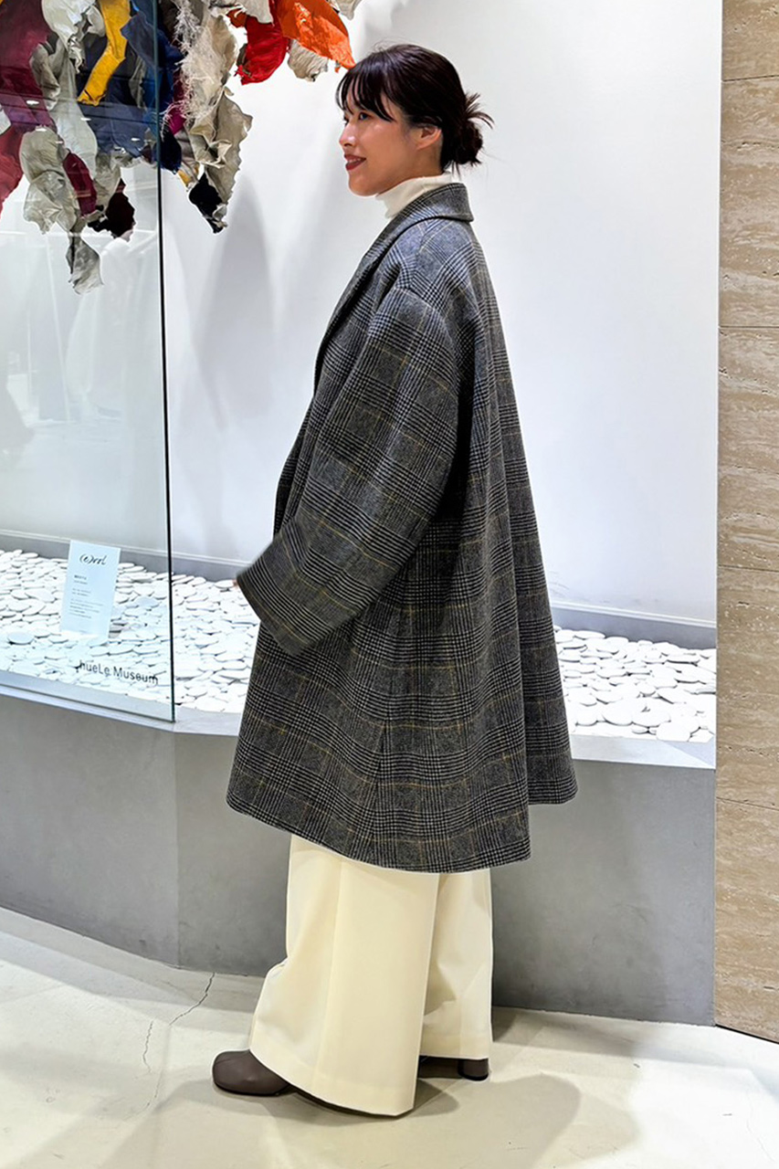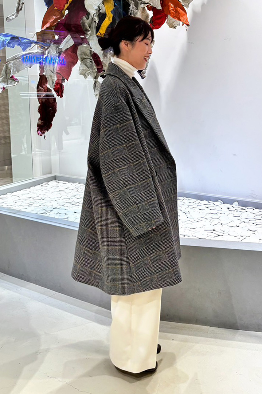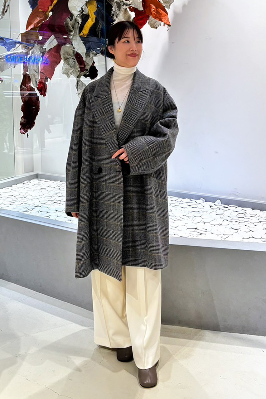 国内で丁寧に織り上げたウールのダブルクロスチェック素材を使用し、グレンチェックにウインドーペーンをアクセントにしたクラシカルな表情を現代的なオーバーサイズシルエットに昇華。