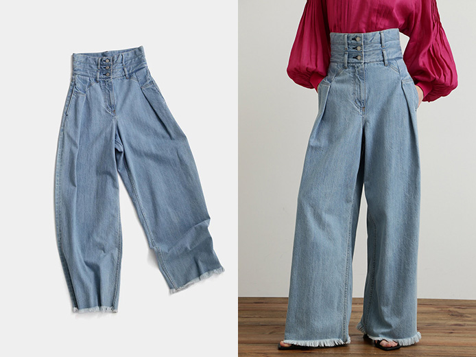 まっすぐに落ちる美しいワイドシルエットは、デニムながらもクチュールライクな雰囲気を醸し出してくれそう。