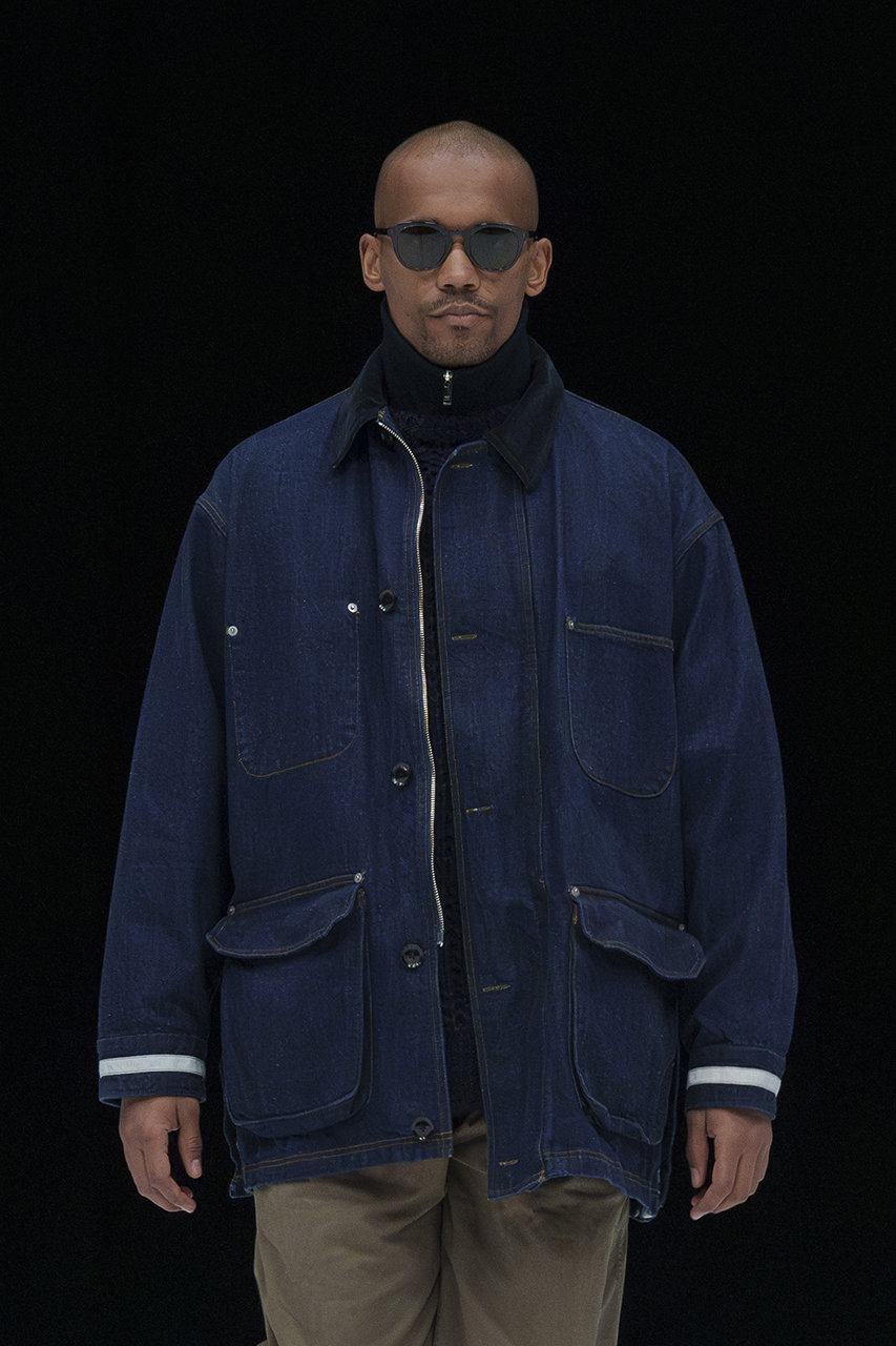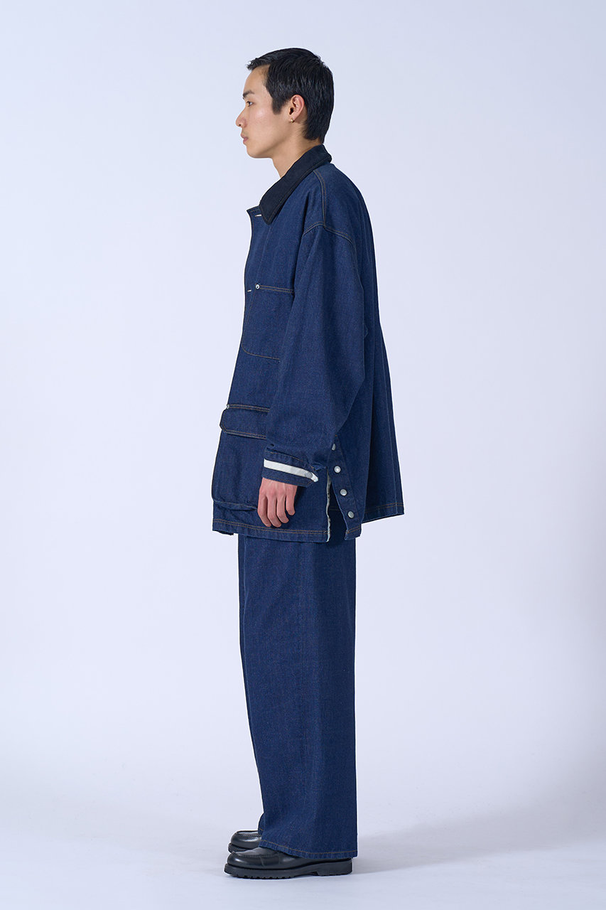 カバーオールジャケットをハーフコート丈までサイズ感を大きくした新型のデニムコートが到着。衿はコーデュロイで、カジュアルにはあまり使用しないような水牛ボタンがモダンな印象をプラス。タテヨコ共に高品質のムラ糸を使用してヴィンテージ感のある生地を目指したデニムは、少し軽さがあり、タテ糸ヨコ糸のバランスを調整して、しっかりとした見た目に仕上げている。硫化染料を混ぜずにインディゴのみで染色し、特濃色のインディゴブルーを採用したこだわりの1枚が、大人のワードローブを格上げしてくれそう。