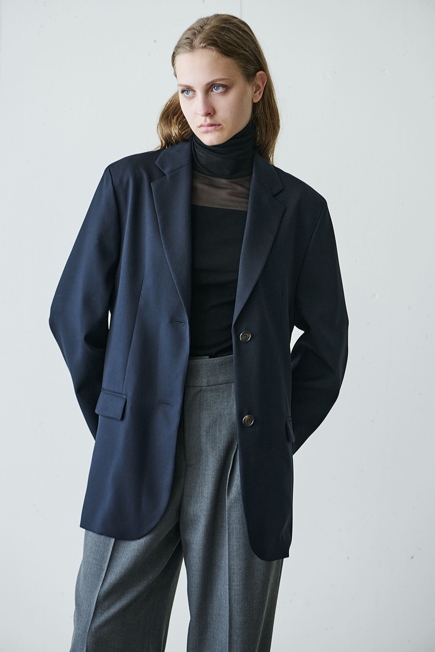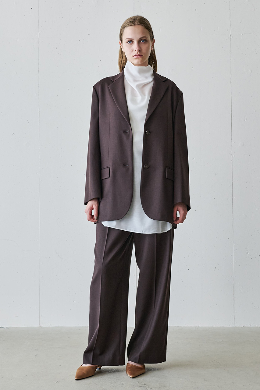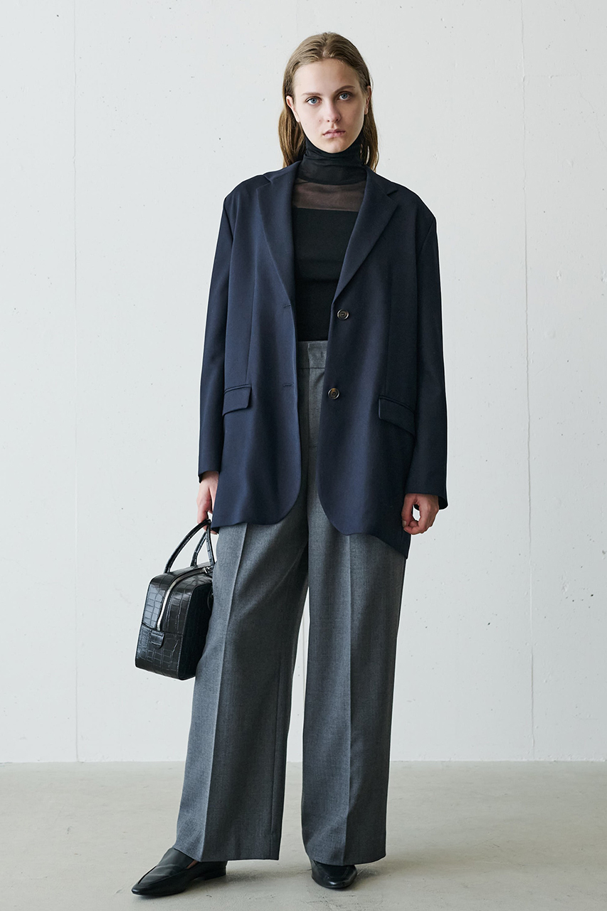 端正なイメージを保ちつつ、今年らしいこなれ感やモードな遊び心をプラスできるオーバーサイズのテーラードジャケット。オーストラリア産のヴァージンウールSUPER100とヴィスコースをブレンドし、梳毛糸に仕立てた生地は、メンズライクでクラシカルな風合いが魅力。同素材のワイドパンツとのセットアップもおすすめ。