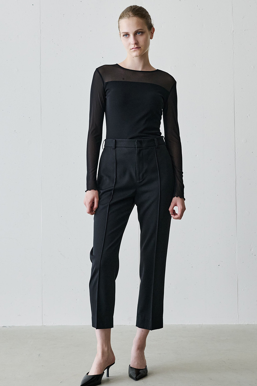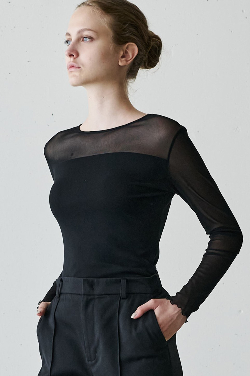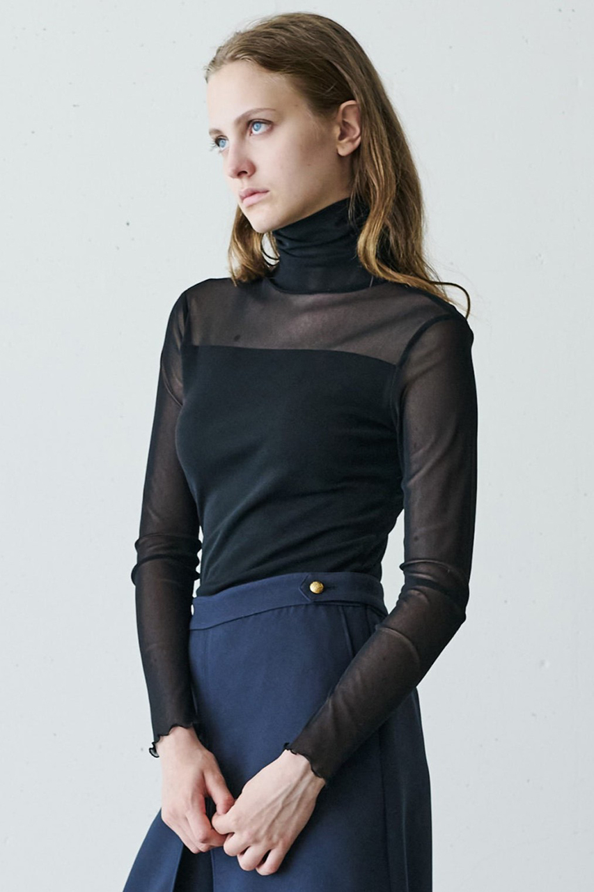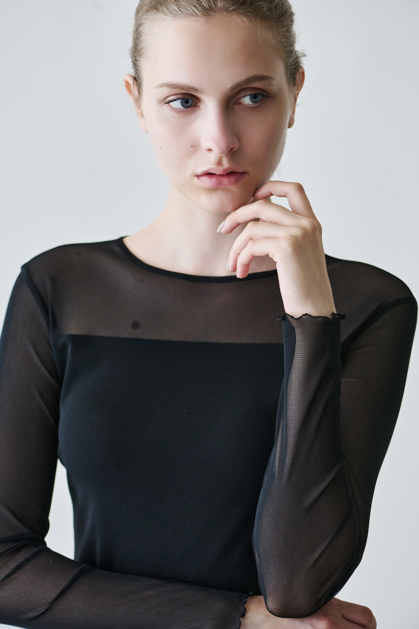 一枚で、重ね着で、着こなしの完成度を高める。シアーでのびやかなオーガンジートップス。黒のアクセントを効かせつつ、もたつかずすっきりと着こなせるから日々の着回しに活躍の予感。ストレッチの効いたサモーラ糸を使用し、繊細な透け感とのびやかな肌あたりのよさを両立。