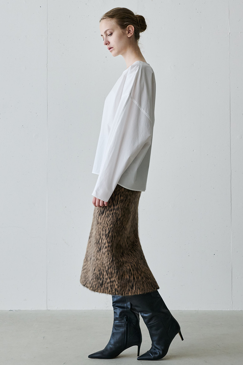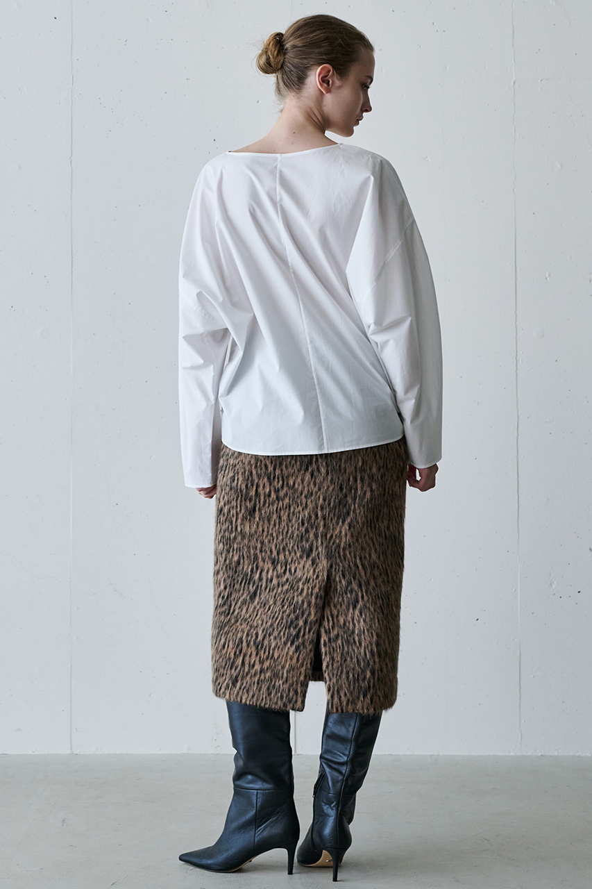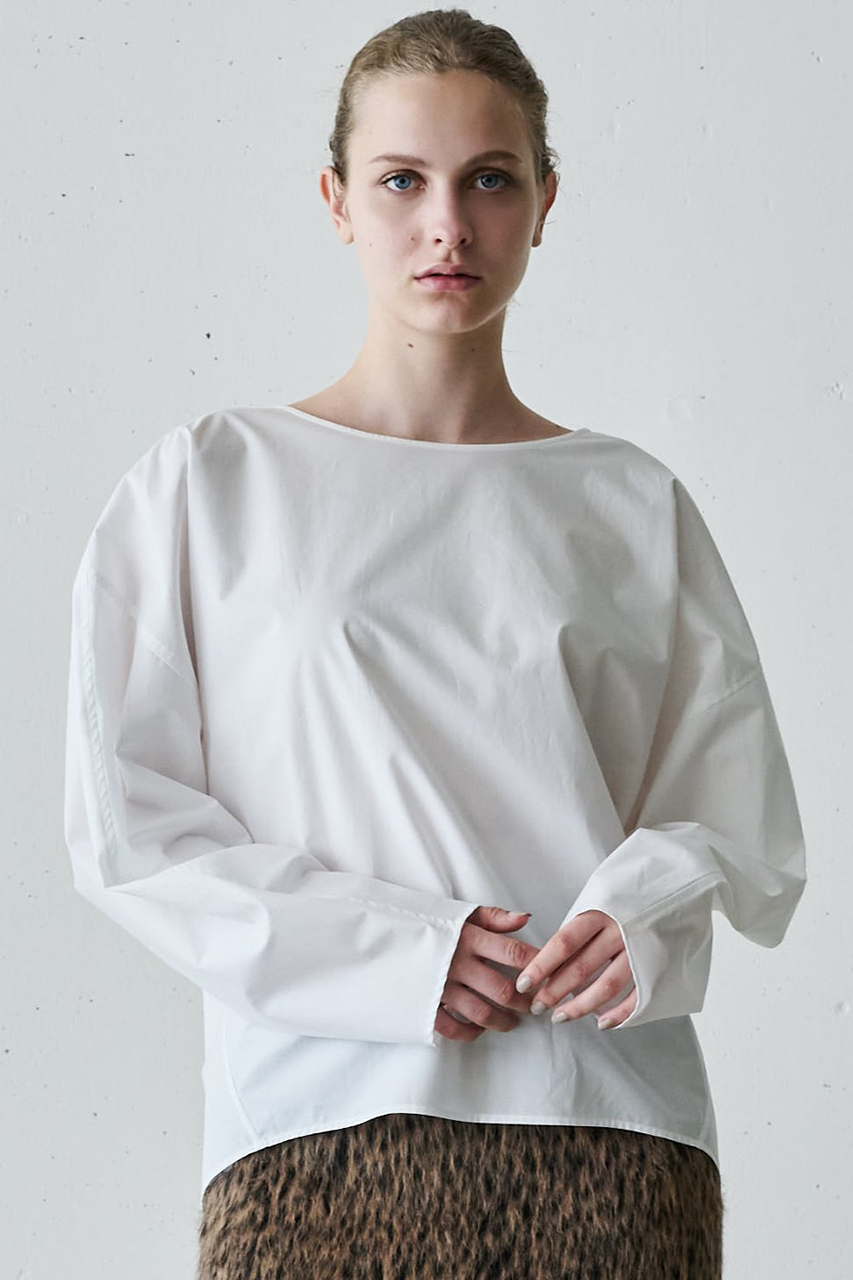 Tシャツのように毎日着たくなる、シンプルで活躍頻度の高いブラウス。極細の糸を高密度に織り上げたタイプライター生地を採用し、ハリがありながらしなやかな落ち感のある仕上がりに。ゆったりと中で身体が泳ぐような、リラックスフィットの身頃。たっぷりとした袖のシルエットは、手首を華奢に見せる効果が。
