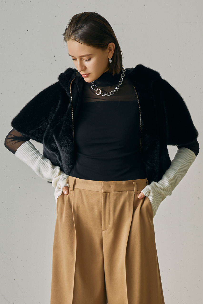 光沢のあるミンク調のエコファーは、贅沢なボリューム感があるのに驚くほど軽い着心地。