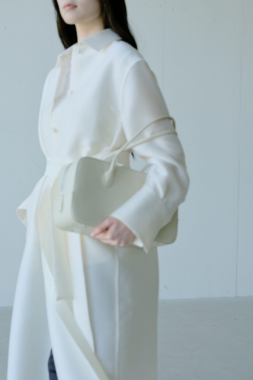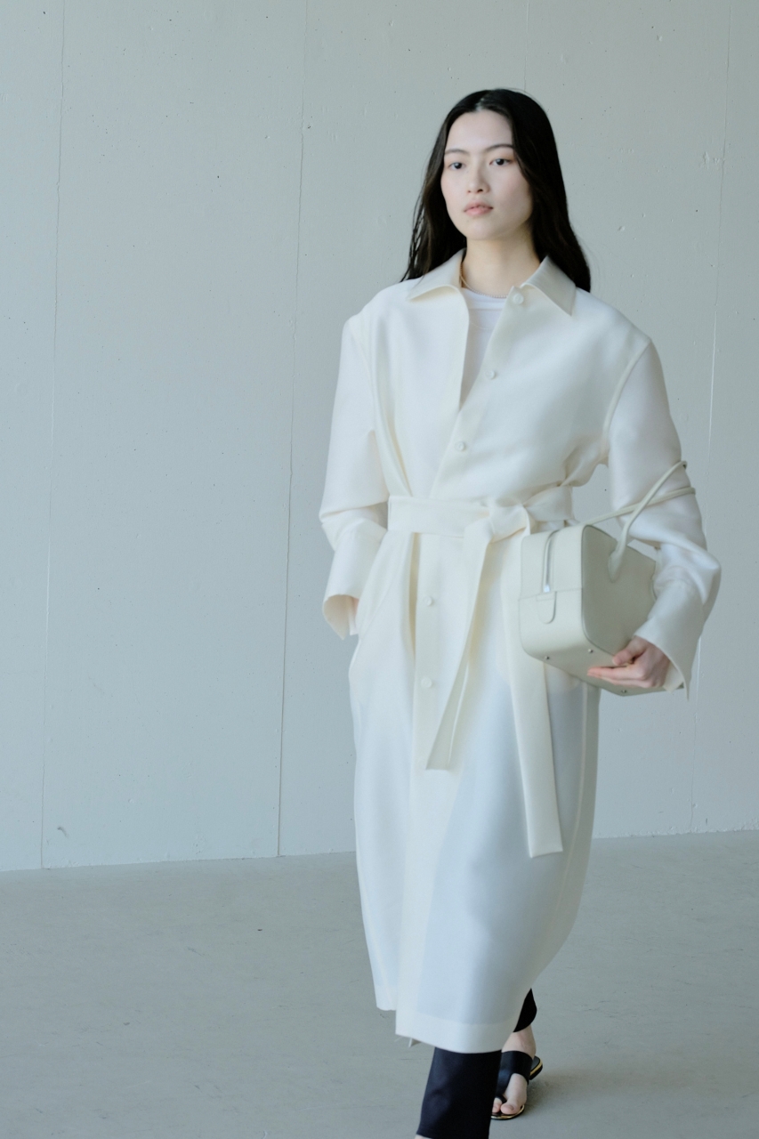 構築的なフォルムとクリーンな色が重なり、透明感のある洗練された装いに。