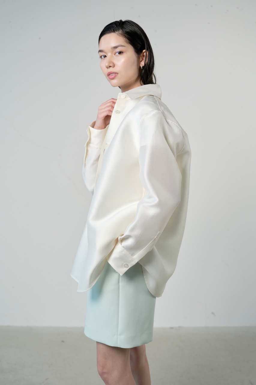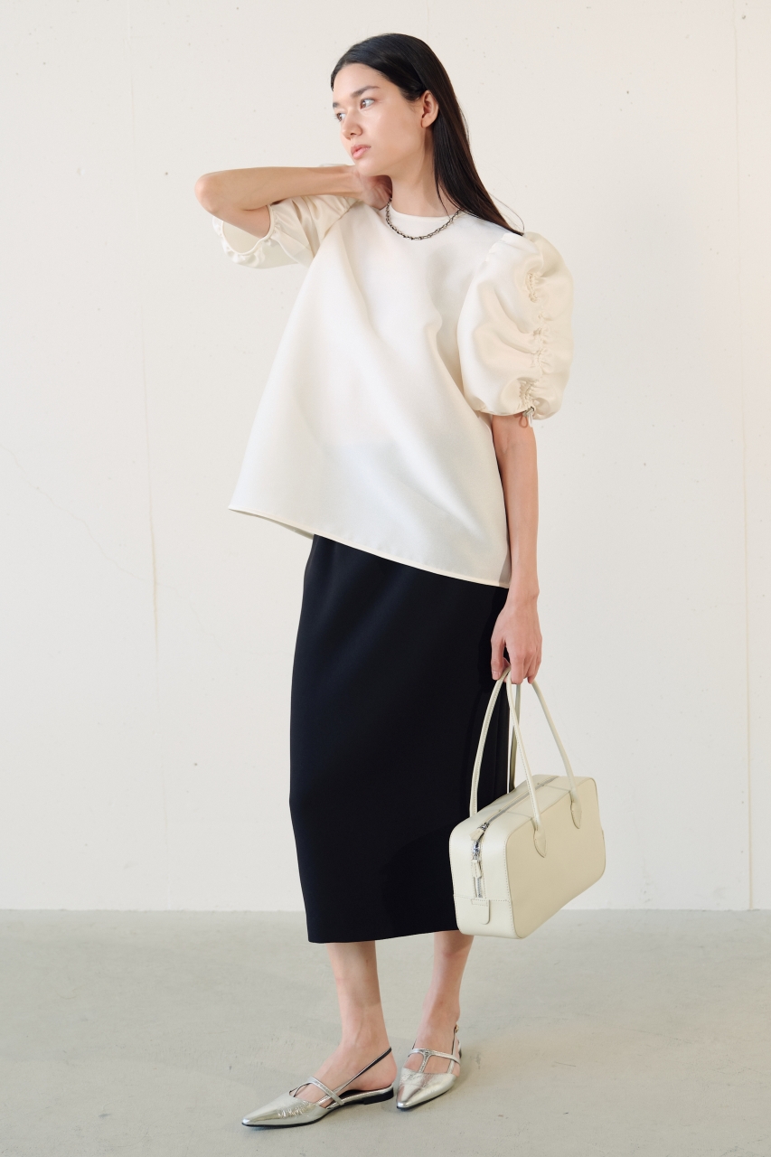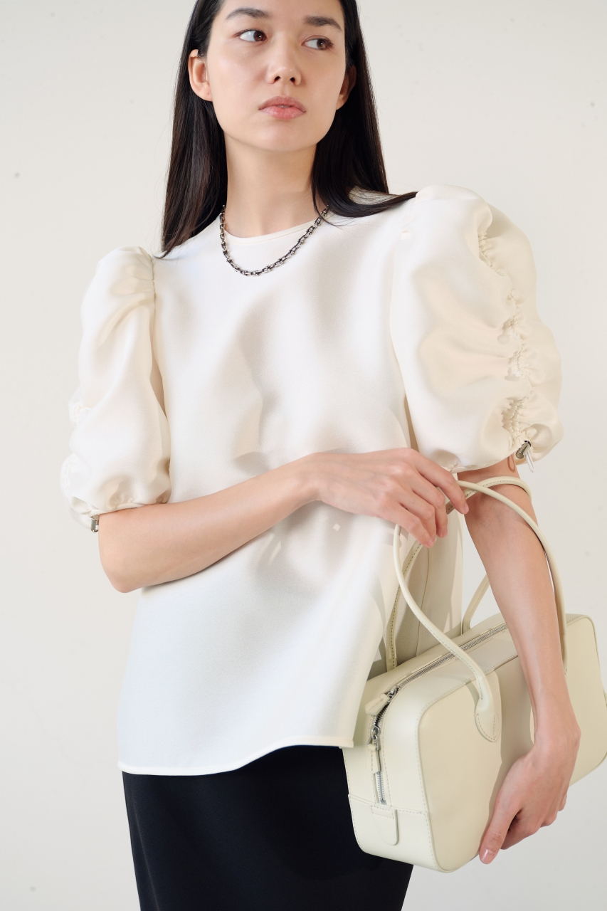 軽さとハリを兼ね備えたこの素材が、構築的なシルエットを美しく際立たせます。