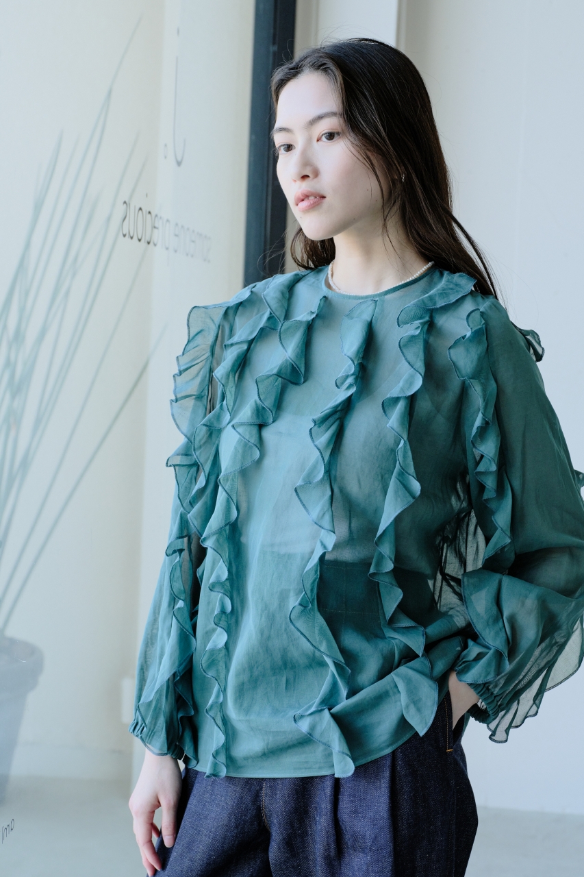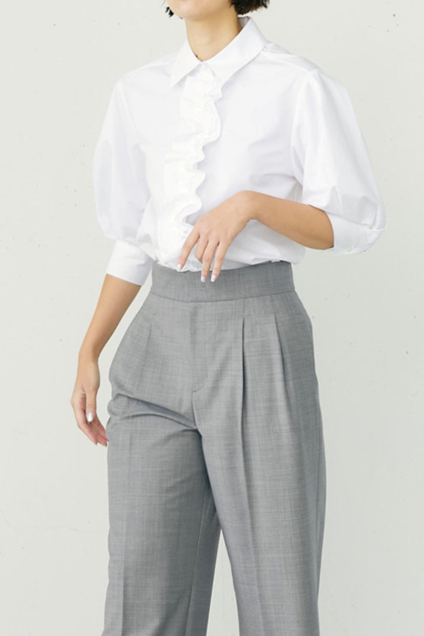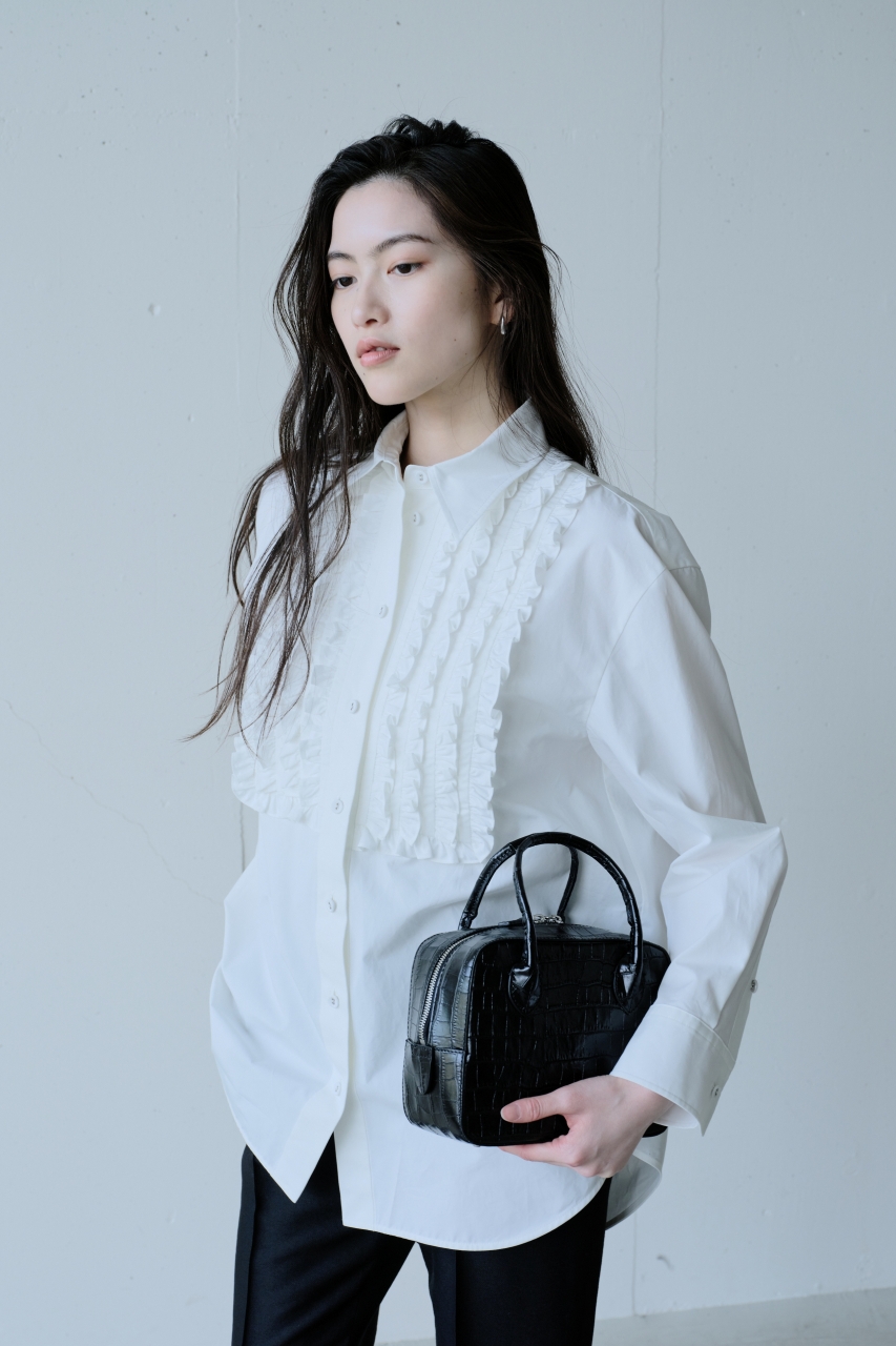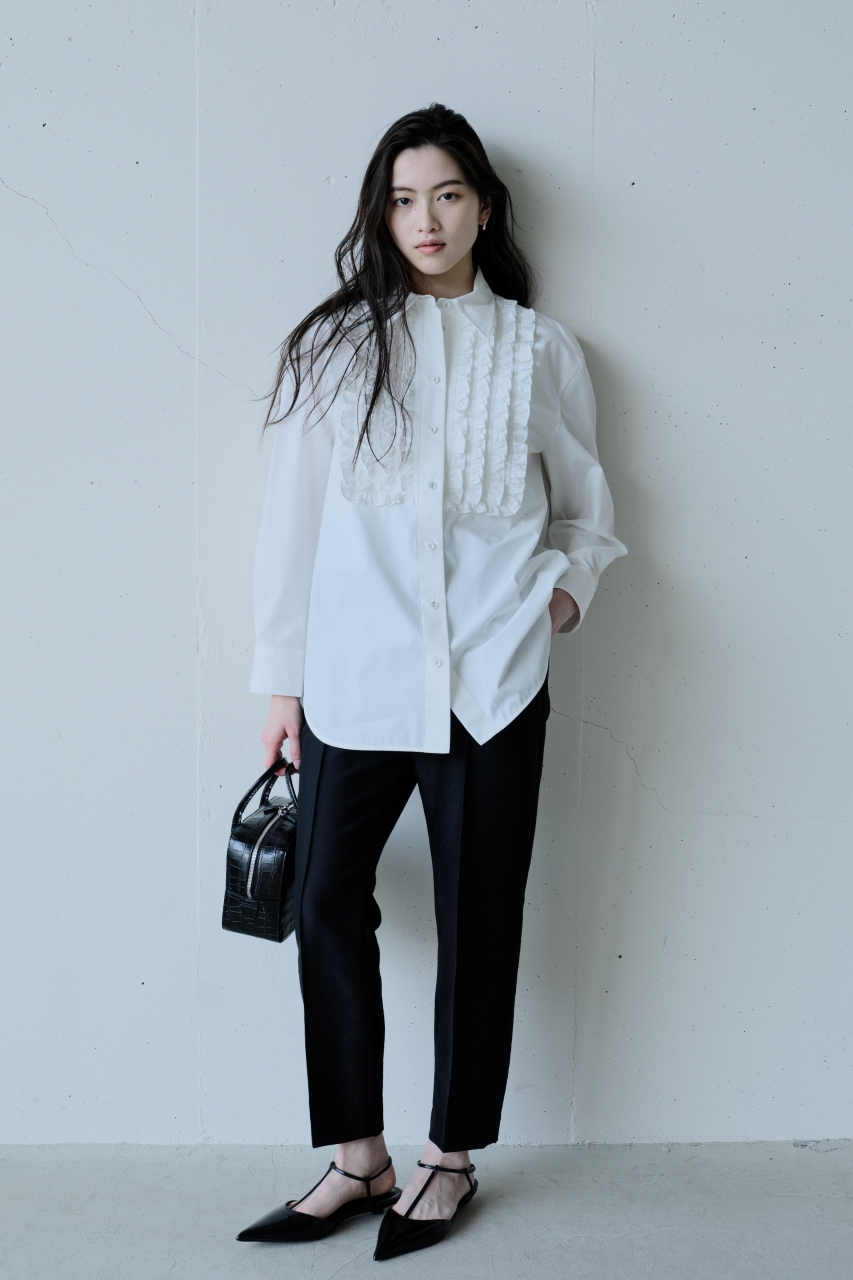 フリルやディテールが、装いにほどよい華やかさをプラス。