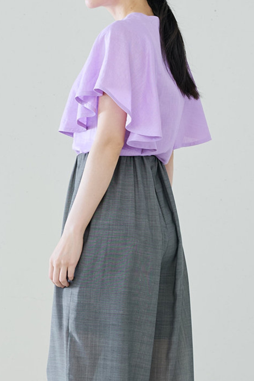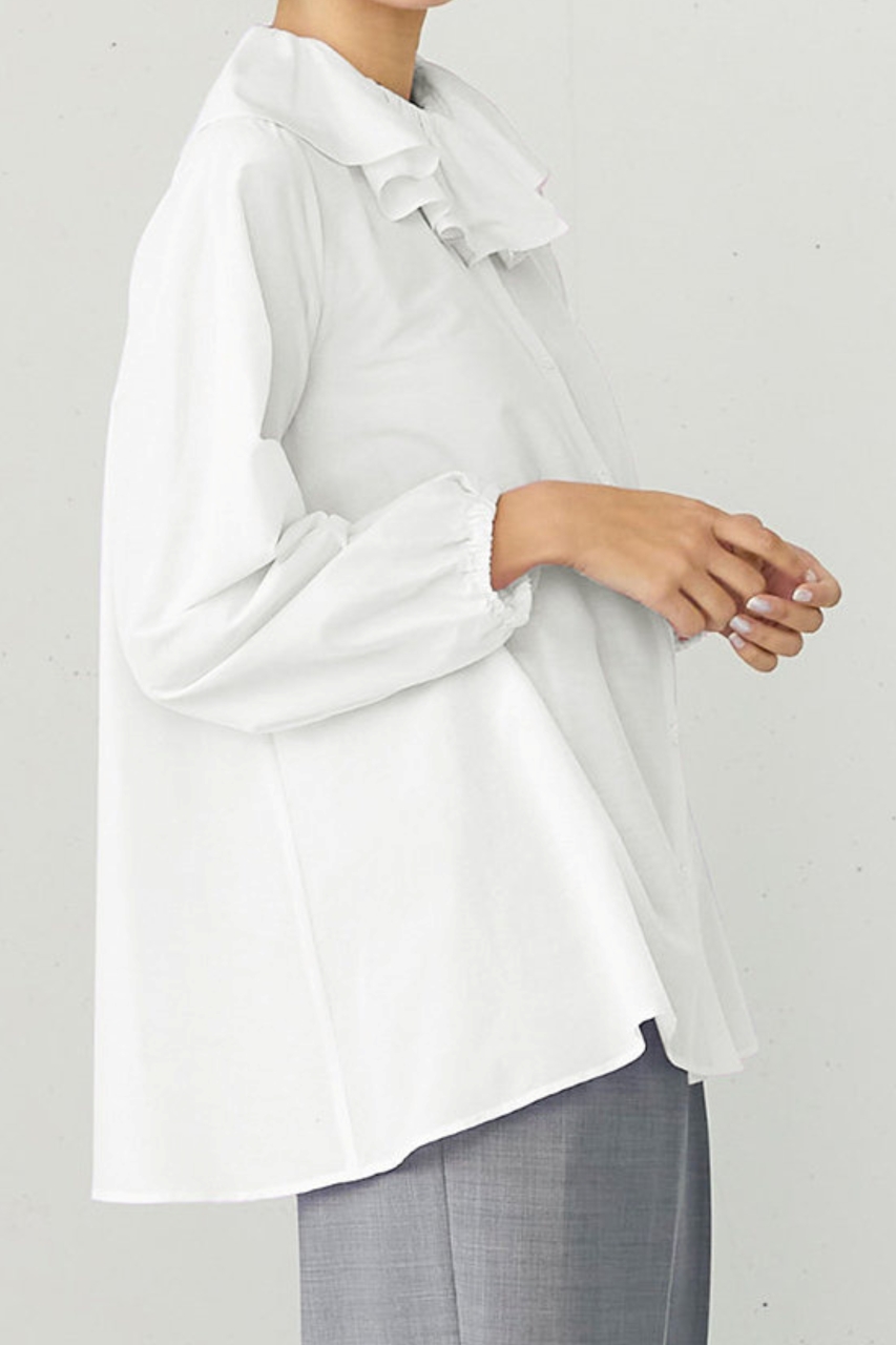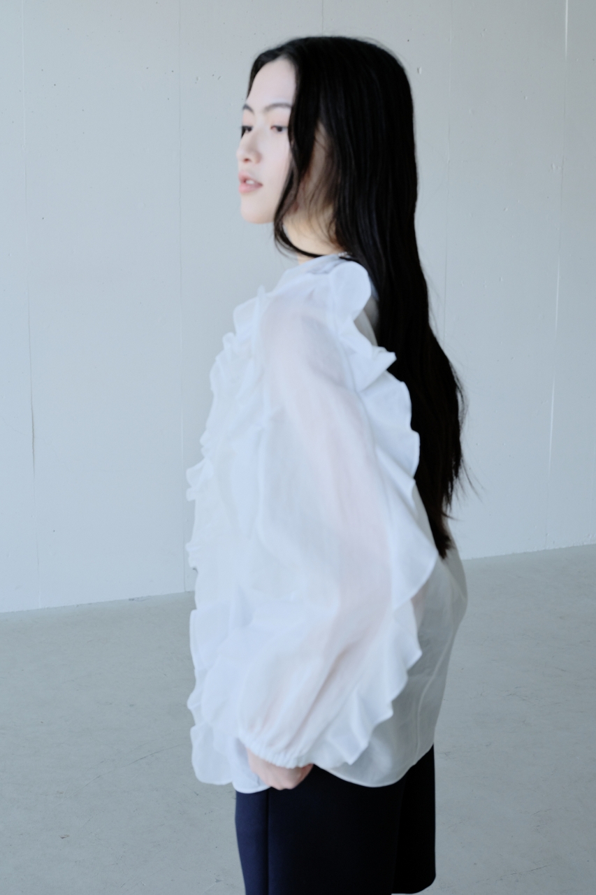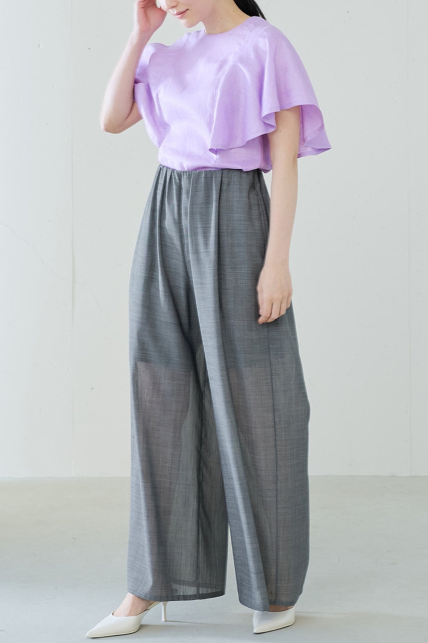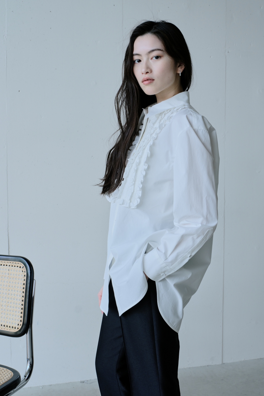 フリルやディテールが、装いにほどよい華やかさをプラス。