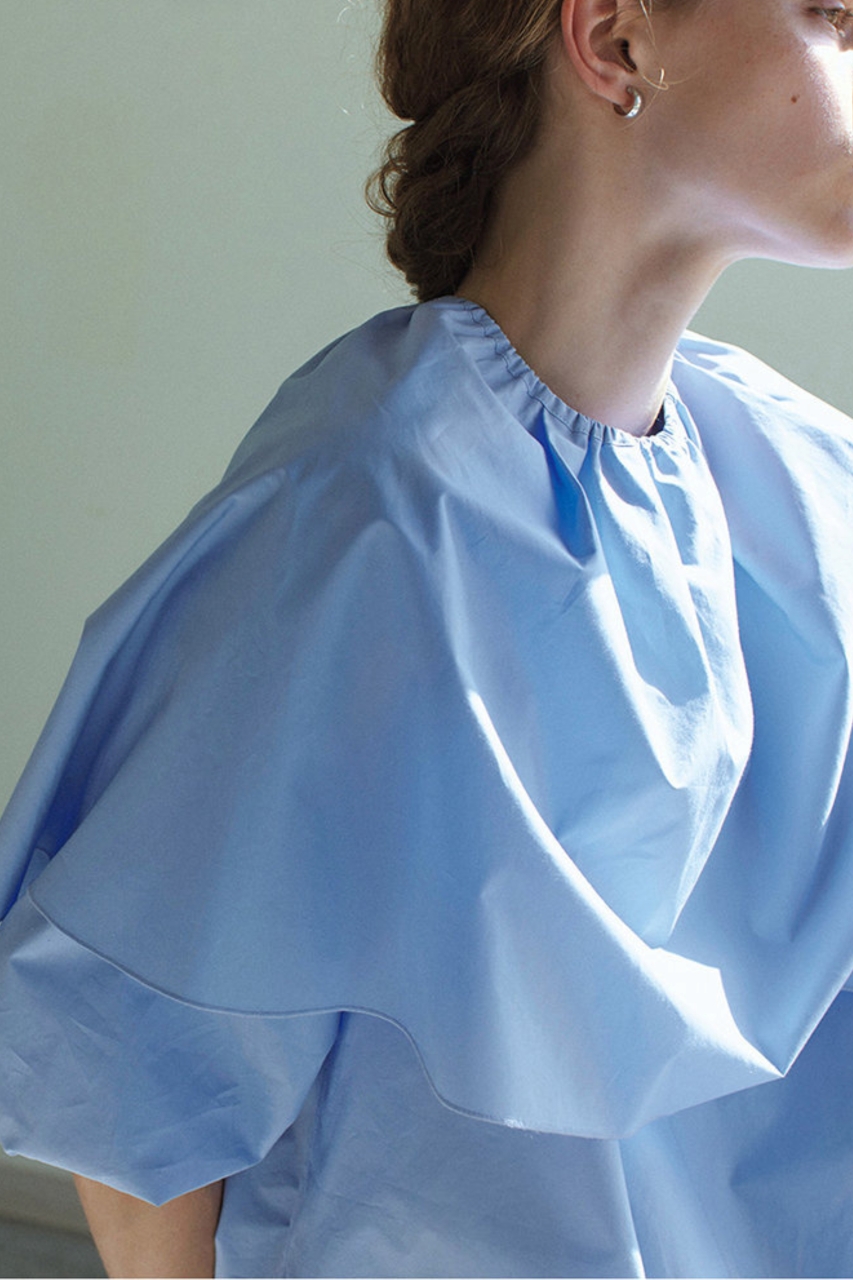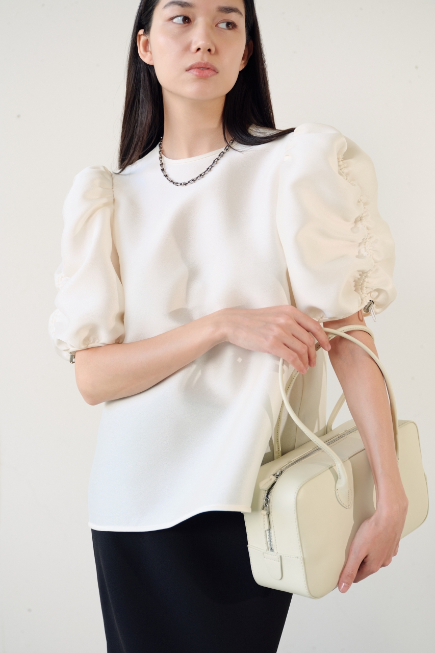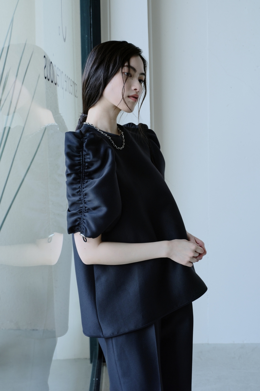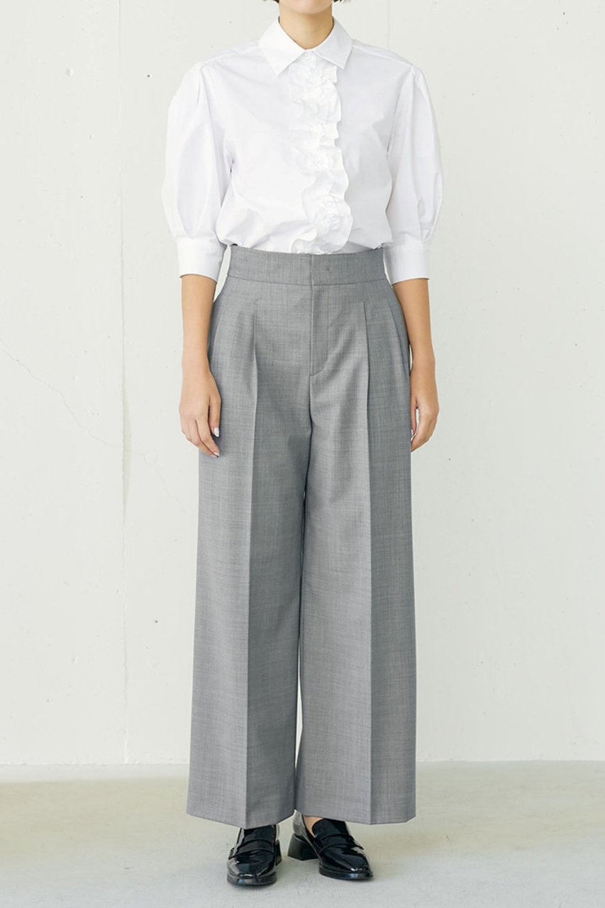 フリルやディテールが、装いにほどよい華やかさをプラス。