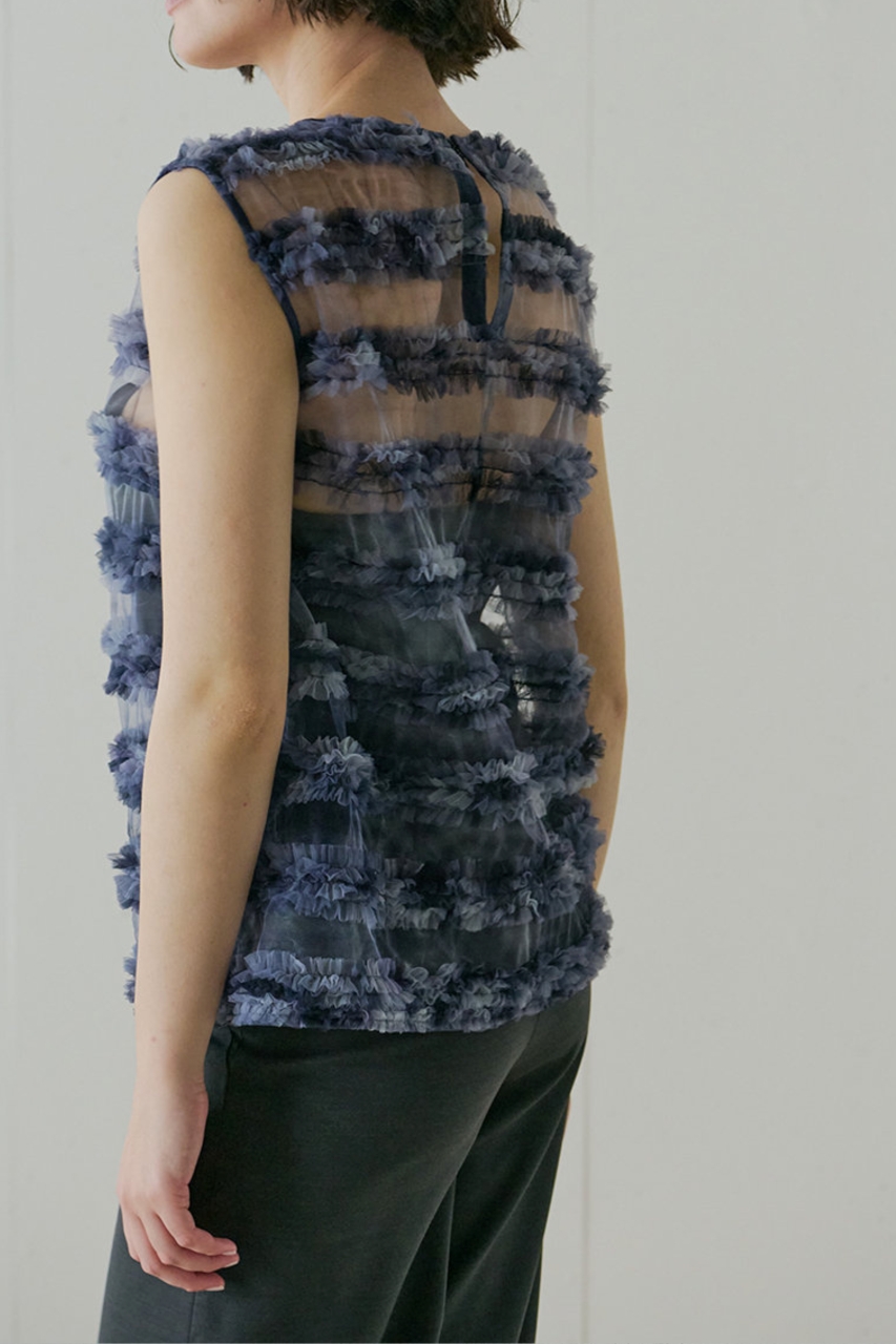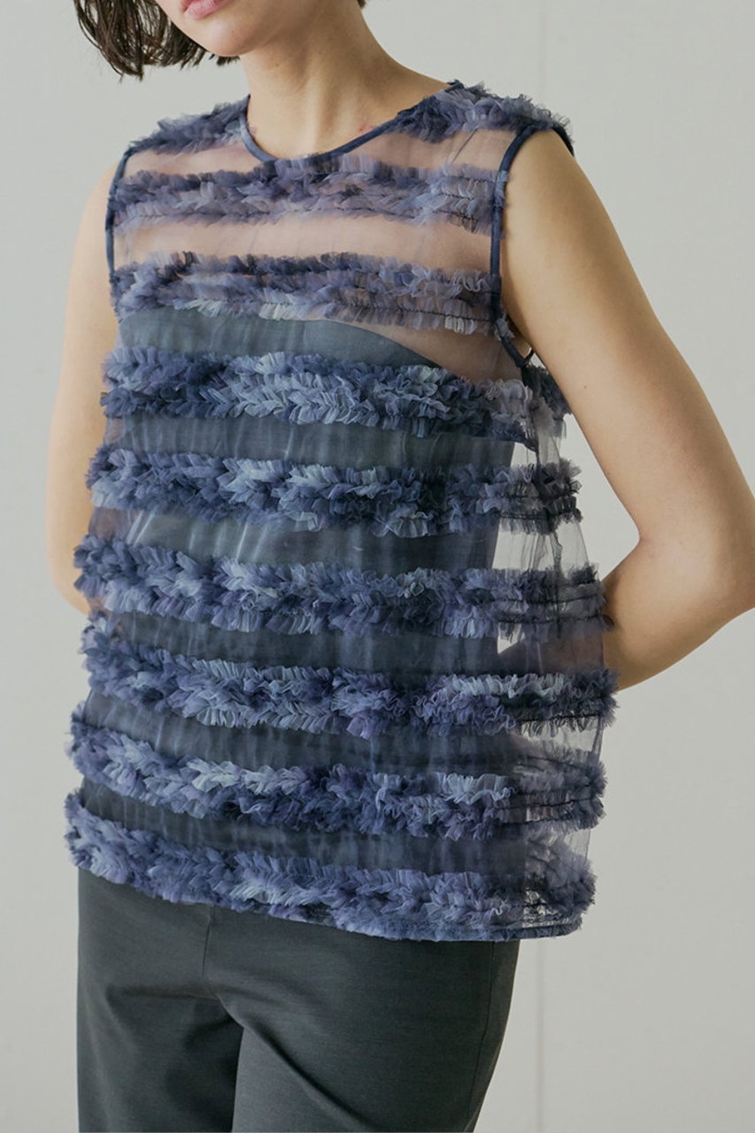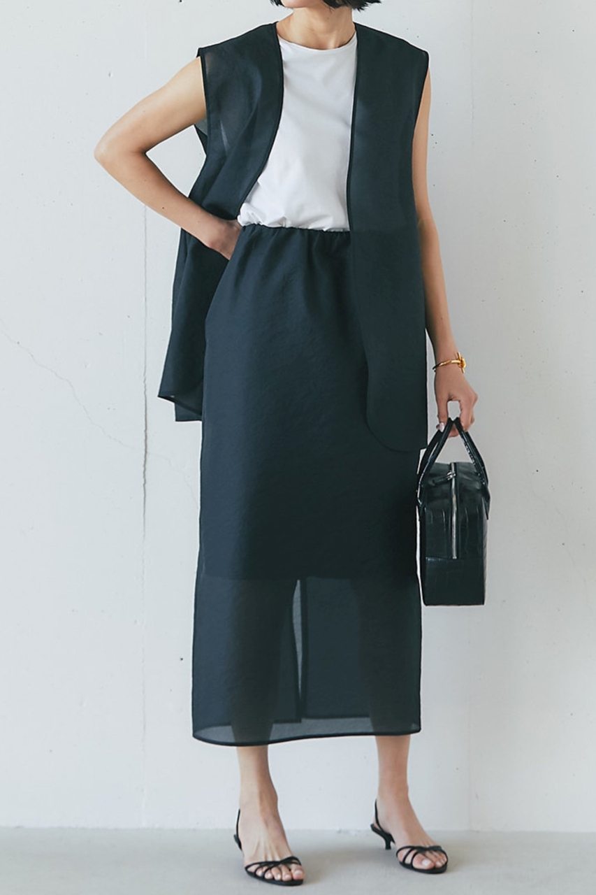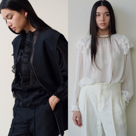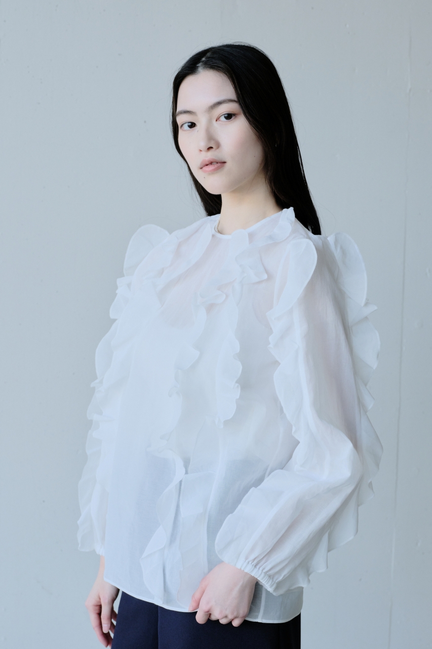 繊細な透け感が装いに奥行きを生み、フリルやディテールも重くならず自然に映えます。