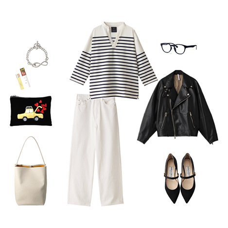 オーバーサイズのライダースジャケットに、ボトムスはデニムで抜け感をプラス。ホワイトカラーのバッグを合わせることで、ラフすぎない雰囲気に仕上がります。