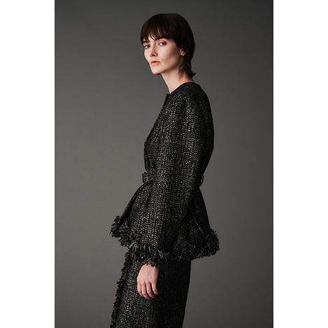 時代感を押さえた提案に定評がある「BONOTTO」社はパリの生地展でも注目を集める歴史あるテキスタイルメーカー。今回使用しているこちらの素材はジャガード機で織られたラメ入りツィード。インポートならではのラメの意匠糸を使用した豪華なツィード素材。ジャガード機による奥行き感と立体感を感じさせるラグジュアリーツィードに。